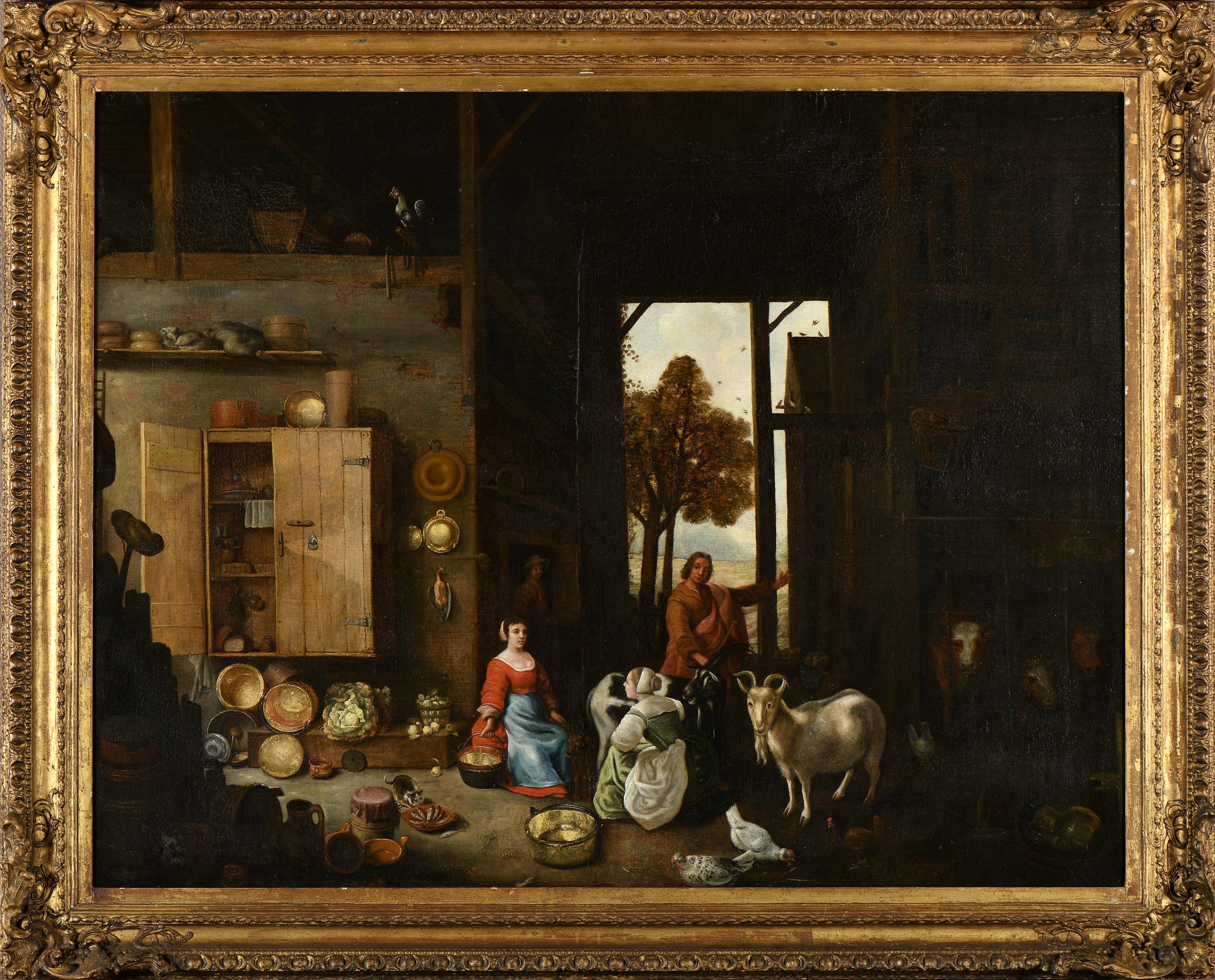 Interior de cozinha com figuras e animais óleo sobre tela escola Alemã séc. XVII reentelado, restauros, vinco no suporte assinado H. SCHALL e datado de 1650 Dimensões (altura x comprimento x largura) - 105 x 136 cm