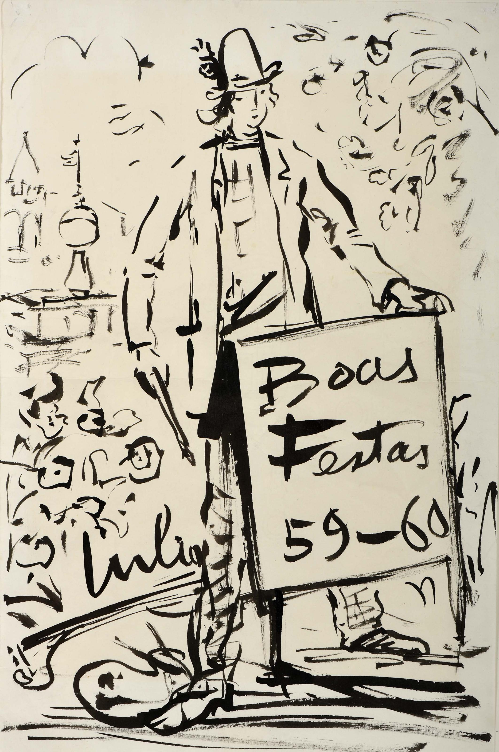 JÚLIO DOS REIS PEREIRA - 1902-1983 "Boas Festas 59-60" tinta da China sobre papel assinada Dimensões (altura x comprimento x largura) - 34 x 22,2 cm Notas: obra reproduzida em "Moderno e Contemporâneo: a Colecção de João Esteves de Oliveira". Lisboa: Galeria João Esteves de Oliveira, 2019, p. 387.
