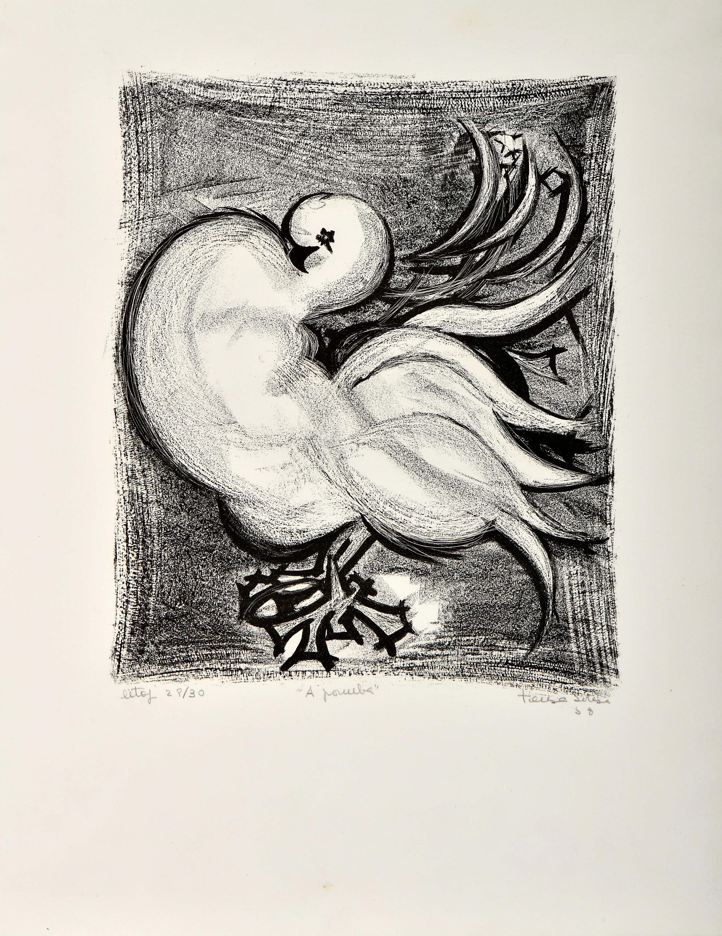 TERESA SOUSA - 1928-1962 "A pomba" litografia sobre papel assinada e datada de 1958, marcada LITOF, numerada 28/30 Dimensões (altura x comprimento x largura) - (mancha) 33 x 27 cm Notas: Apesar de formada em pintura, Teresa Sousa descobriu em Paris, por recomendação de Vieira da Silva, a sua vocação para a gravura. Entre 1955 e 1956 estudou com S. W. Hayter no célebre Atelier 17, experiência decisiva e inovadora numa época em que a gravura artística era pouco valorizada em Portugal.As suas primeiras obras, de 1956, revelam a influência de Hayter e do Atelier 17, sendo realizadas em buril, água-forte e técnicas mistas. Contudo, Teresa Sousa explorou também linoleogravura, litografia e xilogravura. A formação no Atelier 17 consolidou o seu reconhecimento como pioneira da gravura moderna portuguesa.Entre 1955 e 1961 foi uma artista prolífica e premiada, mas a morte precoce aos 33 anos interrompeu uma carreira promissora. Deixou diversos trabalhos e estudos inacabados.Presentemente os filhos da artista estão divulgar a obra da sua mãe e a tentar recolocar o seu nome no panorama das artes plásticas em Portugal, tendo até agora conseguido promover a realização de quatro exposições: “(Re)Descobrir Teresa Sousa. Gravura – 60 anos depois” - Biblioteca Nacional de Portugal, 07-11-2022 a 25-02-2023, e Biblioteca Pública de Évora, 15-04-2023 a 20-05-2023; “Teresa Sousa – fragmentos de um breve percurso” - Centro UNESCO, Beja, 08-11-2023 a 29-12-2023; “Teresa Sousa (1928-1962) – Biografia Ilustrada” - Galeria Municipal do Onze, Setúbal, 03-02-2024 a 09-03-2024; e “Continuar a (re)descobrir Teresa Sousa (1928-1962)” - Galeria Municipal TREM - Manuel Baptista, Faro, 12 de Julho a 11 de Outubro de 2025.