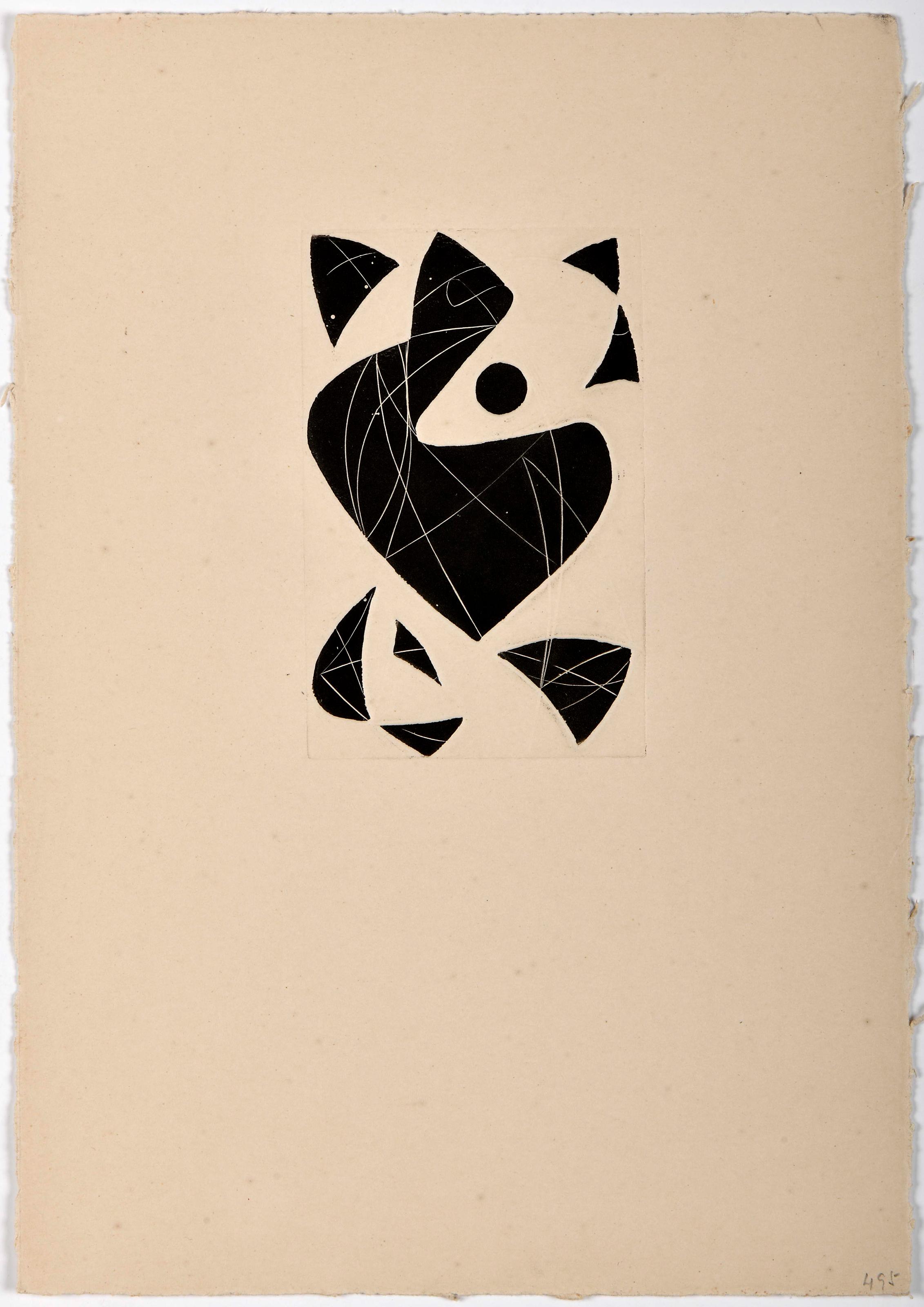 TERESA SOUSA - 1928-1962 "Composição" água-forte e buril sobre papel a partir de placa de cobre não assinada, não datada (Paris - Atelier 17 - 1956) Dimensões (altura x comprimento x largura) - (mancha) 10,4 x 6,6 cm Notas: Apesar de formada em pintura, Teresa Sousa descobriu em Paris, por recomendação de Vieira da Silva, a sua vocação para a gravura. Entre 1955 e 1956 estudou com S. W. Hayter no célebre Atelier 17, experiência decisiva e inovadora numa época em que a gravura artística era pouco valorizada em Portugal.As suas primeiras obras, de 1956, revelam a influência de Hayter e do Atelier 17, sendo realizadas em buril, água-forte e técnicas mistas. Contudo, Teresa Sousa explorou também linoleogravura, litografia e xilogravura. A formação no Atelier 17 consolidou o seu reconhecimento como pioneira da gravura moderna portuguesa.Entre 1955 e 1961 foi uma artista prolífica e premiada, mas a morte precoce aos 33 anos interrompeu uma carreira promissora. Deixou diversos trabalhos e estudos inacabados.Presentemente os filhos da artista estão divulgar a obra da sua mãe e a tentar recolocar o seu nome no panorama das artes plásticas em Portugal, tendo até agora conseguido promover a realização de quatro exposições: “(Re)Descobrir Teresa Sousa. Gravura – 60 anos depois” - Biblioteca Nacional de Portugal, 07-11-2022 a 25-02-2023, e Biblioteca Pública de Évora, 15-04-2023 a 20-05-2023; “Teresa Sousa – fragmentos de um breve percurso” - Centro UNESCO, Beja, 08-11-2023 a 29-12-2023; “Teresa Sousa (1928-1962) – Biografia Ilustrada” - Galeria Municipal do Onze, Setúbal, 03-02-2024 a 09-03-2024; e “Continuar a (re)descobrir Teresa Sousa (1928-1962)” - Galeria Municipal TREM - Manuel Baptista, Faro, 12 de Julho a 11 de Outubro de 2025.
