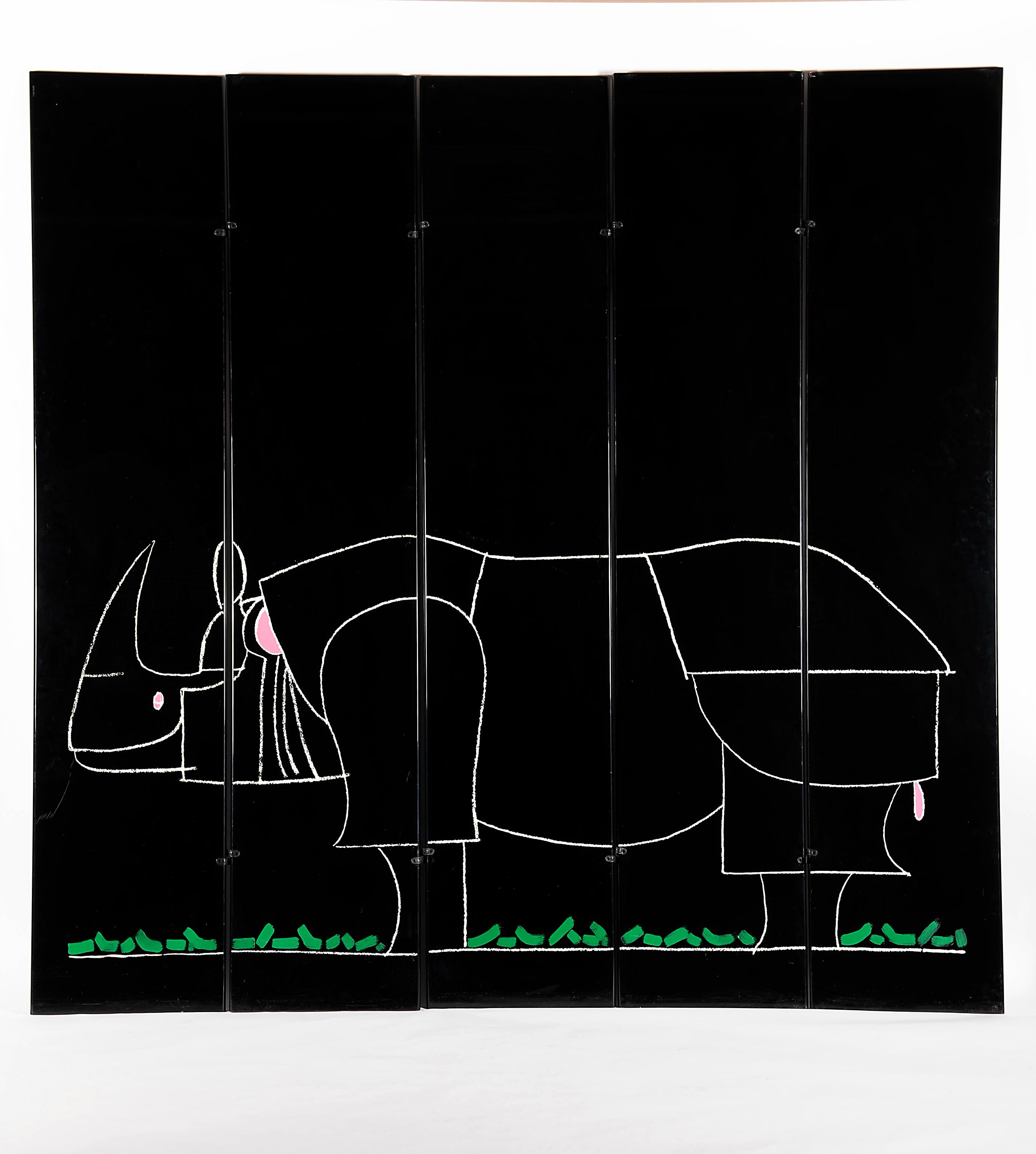 FRANÇOIS-XAVIER LALANNE - 1927-2008 & KAZUHIDE TAKAHAMA - 1930-2010 Biombo “Rhinocéros” - da série "Ultramobile" (c. 1976) madeira lacada e serigrafada dobradiças em borracha uma dobradiça partida, marcas de furação no verso, empenos, pequenos defeitos, sinais de uso Dimensões (altura x comprimento x largura) - (cada folha) 220 x 45 cm; (total) 220 x 229 cm Notas: Proveniência: Colecção Manuel Reis.