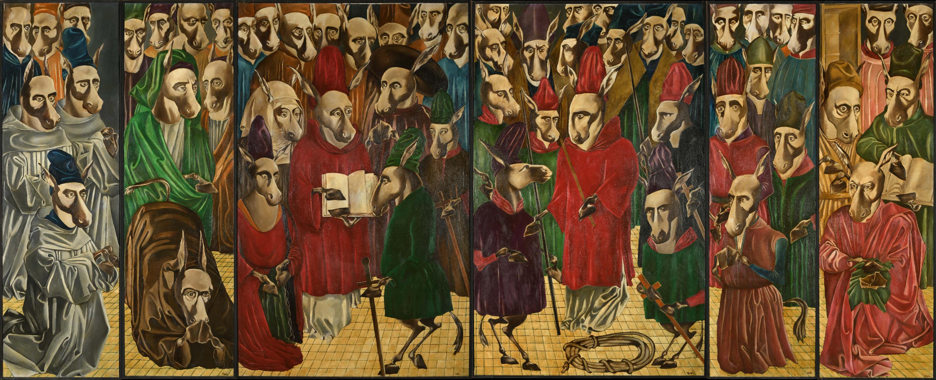 ARTUR VARELA - 1937-2017 "O Mistério do enigma" da séria Mare Portucalae painel de seis óleos sobre tela sendo o primeiro "Painel dos Frades", segundo "Painel dos Pescadores", terceiro "Painel do Infante", quarto "Painel do Arcebispo", quinto "Painel dos Cavaleiros" e sexto "Painel da Sagrada Relíquia" assinado, assinado e datado de 1995 no verso Dimensões (altura x comprimento x largura) - 207 x 504,5 cm