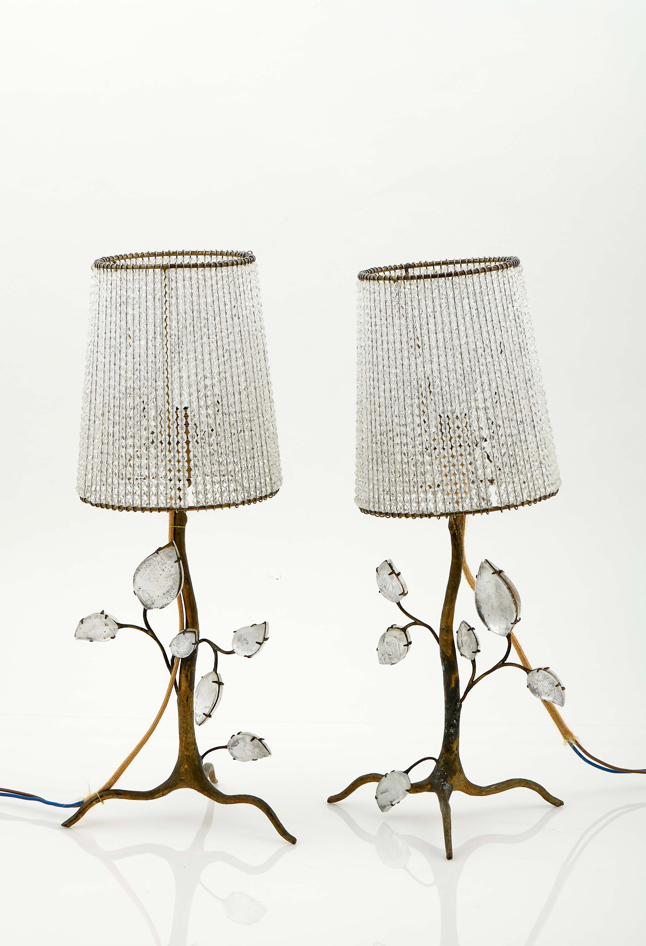 MAISON BAGUÈS Par de candeeiros de mesa - modelo LA-FE-18115-01 estrutura em ferro dourado aplicações "Folhas" em vidro moldado, abat-jour com fieiras de vidrinhos sinais de oxidação, desgaste no dourado marcados Dimensões (altura x comprimento x largura) - 43,2 cm Notas: Colecção Particular - Porto.Vd. https://www.bagues-paris.com/product/la-fe-18115-01/ - consultado a 28-10-2024, às 17:34.