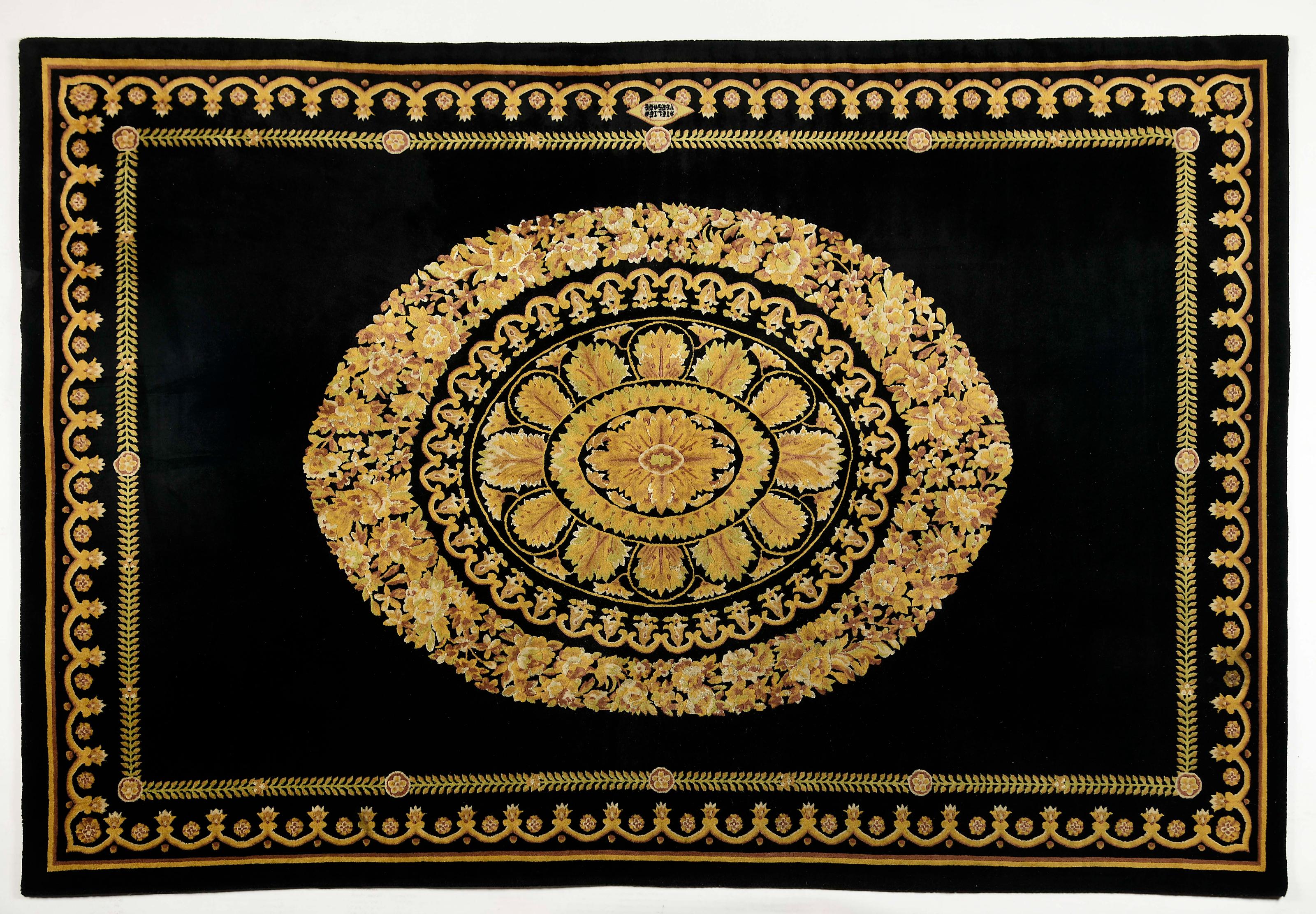 Tapete - Gianni Versace fio de lã decoração policromada sobre fundo negro marcado Atelier Versace Dimensões (altura x comprimento x largura) - 240,5 x 170 cm Notas: Colecção Particular - Porto.