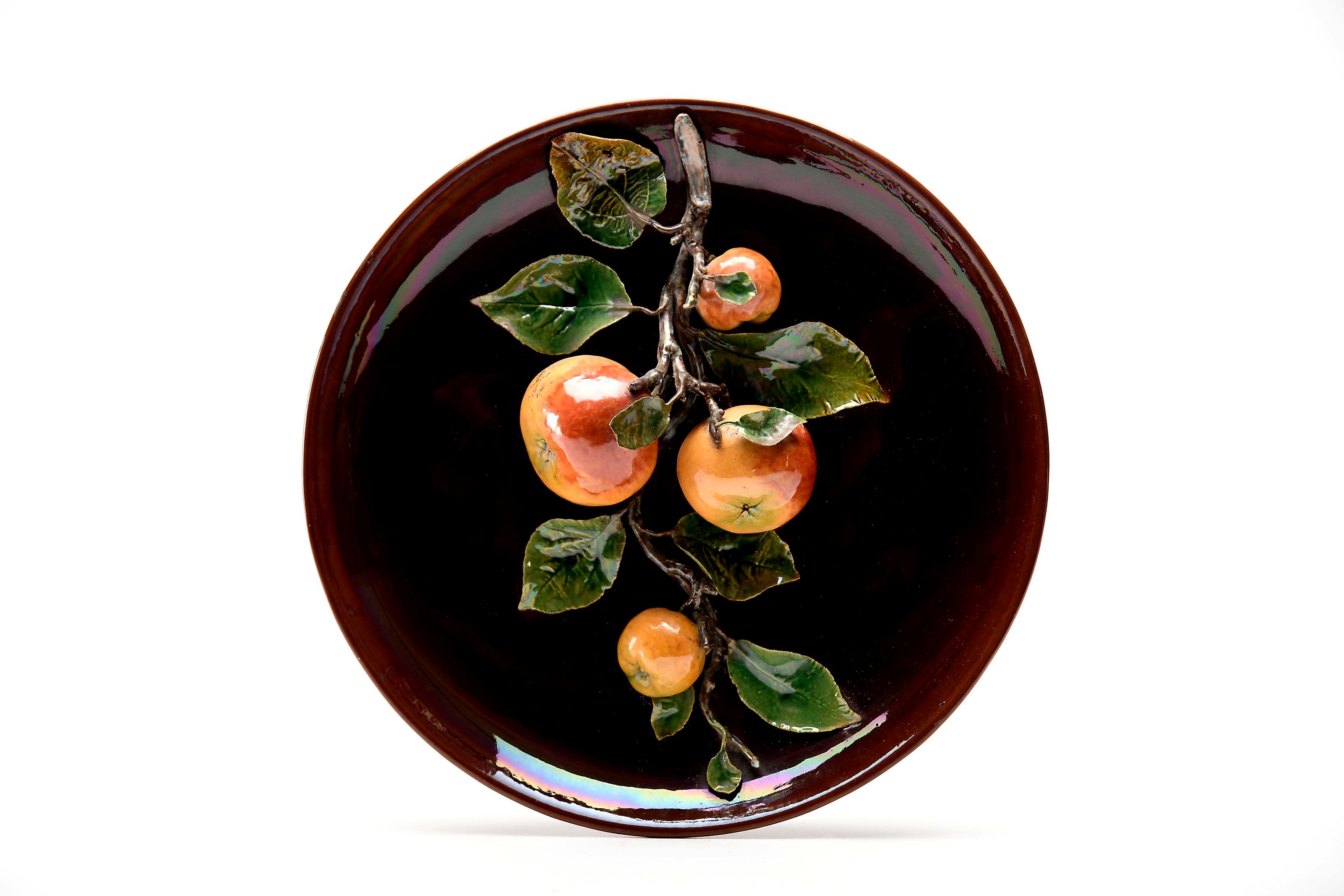 Prato decorativo de suspensão - Maçãs faiança das Caldas decoração relevada e policromada sobre fundo castanho pequenos restauros, pequenas faltas modelo de Rafael Bordalo Pinheiro (1884-1905), marcada da Fábrica de Faianças das Caldas da Rainha (1884-1908) sob direcção artística de Rafael Bordallo Pinheiro (1884-1905), e marca da Fábrica Bordallo Pinheiro sob direcção artística de Manuel Gustavo Bordallo Pinheiro (1908-1920), marcado O (1909) Dimensões (altura x comprimento x largura) - 45,3 cm