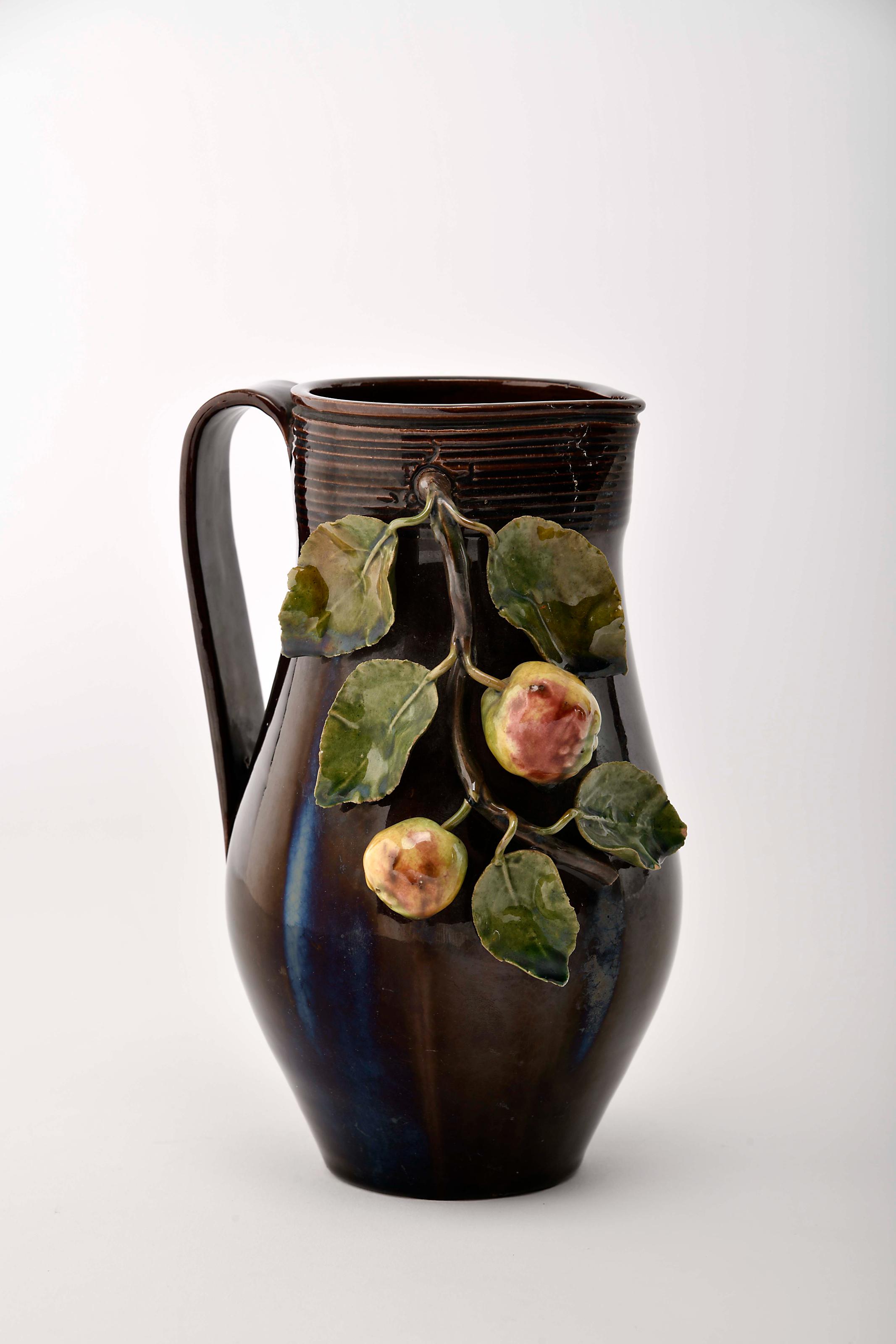 Jarro - Maçãs faiança das Caldas decoração relevada e policromada sobre fundo castanho pequenas esbeiçadelas nos relevos marca da Fábrica Bordallo Pinheiro (1908-1920) sob direcção artística de Manuel Gustavo Bordallo Pinheiro (1908-1920), marcado K (1905) [SIC] Dimensões (altura x comprimento x largura) - 19,1 cm