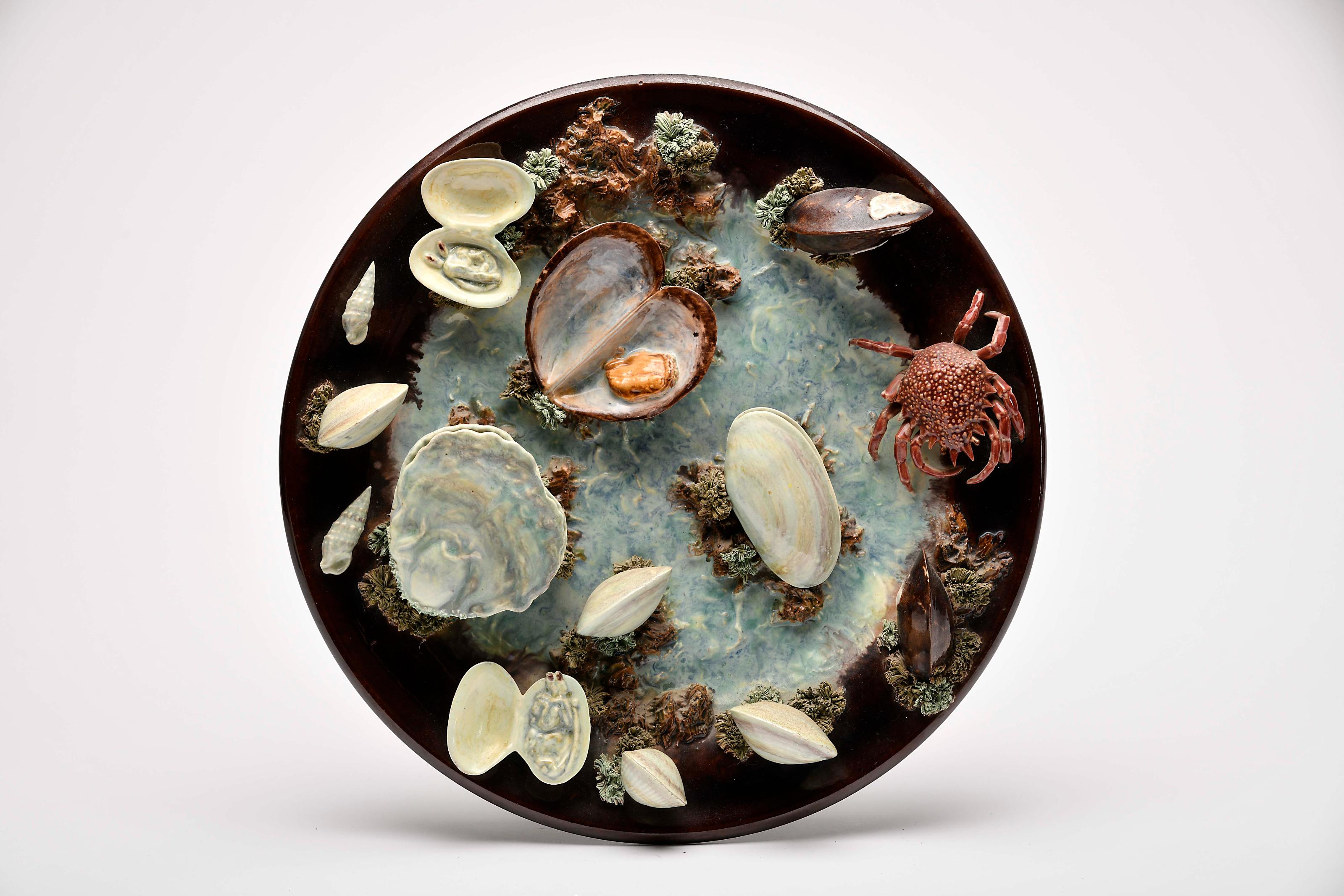 Prato decorativo de suspensão - Crustáceos faiança das Caldas decoração relevada e policromada sobre fundo castanho pequenos restauros, esbeiçadela no bordo, ínfimas esbeiçadelas modelo de Rafael Bordallo Pinheiro (1884-1905), marca da Fábrica Bordallo Pinheiro sob direcção artística de Manuel Gustavo Bordallo Pinheiro (1908-1920), marcado T (1914) Dimensões (altura x comprimento x largura) - 43 cm Notas: exemplar semelhante com fundo castanho integrou a colecção Maldonado Freitas. vd. "A louça das Caldas na colecção de faiança Maldonado de Freitas". Caldas da Rainha: Câmara Municipal das Caldas da Rainha, 2005, p. 56.