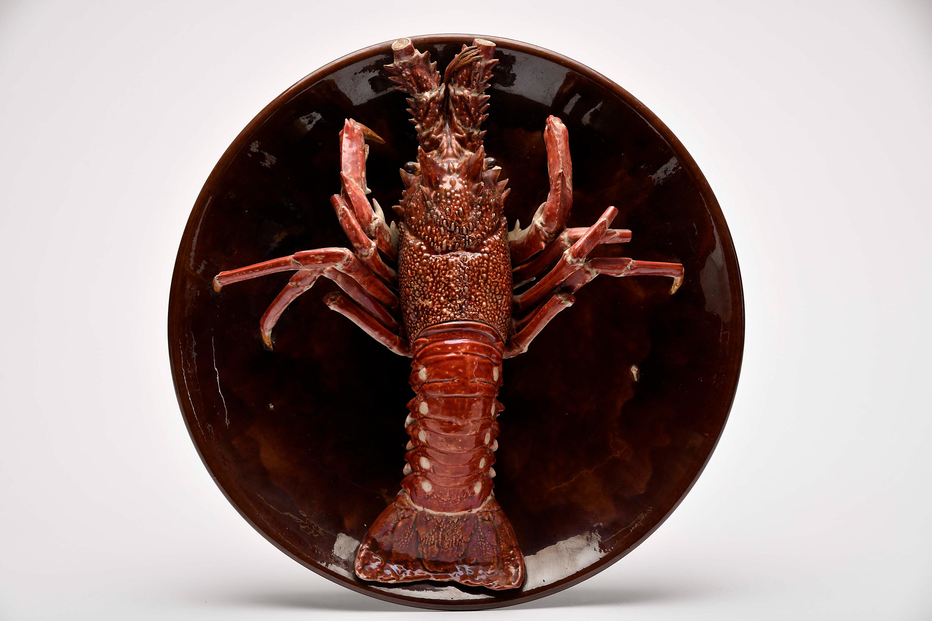 Prato decorativo de suspensão - Lagosta faiança das Caldas decoração relevada e policromada sobre fundo castanho faltas em cinco patas modelo de Rafael Bordalo Pinheiro (1884-1905), marca da Fábrica Bordallo Pinheiro sob direcção artística de Manuel Gustavo Bordallo Pinheiro (1908-1920), marcado T (1914) Dimensões (altura x comprimento x largura) - 45 cm Notas: integrou a colecção de Joaquim Ladeira Baptista.Exemplar idêntico integra a colecção do Museu Rafael Bordalo Pinheiro, Lisboa - Inv. nº 807 - vd. catálogo da exposição “Faianças de Rafael Bordalo Pinheiro”. Lisboa: Câmara Municipal de Lisboa, 1985, p. 82, nº 149.