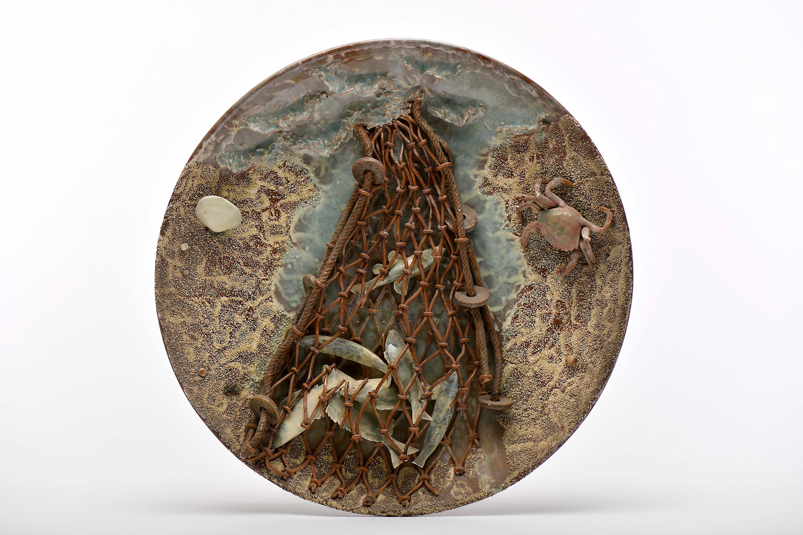 Prato decorativo de suspensão - Peixes presos numa rede de pesca e crustáceos faiança das Caldas decoração policromada e relevada areado e relevado simulando mar faltas na rede, falta da ponta da cauda de um peixe, falta de uma pata do caranguejo modelo de Rafael Bordalo Pinheiro (1884-1905), marca da Fábrica de Faianças das Caldas da Rainha (1884-1908) sob direcção artística de Rafael Bordallo Pinheiro (1884-1905), datado de 1900 Dimensões (altura x comprimento x largura) - 45 cm