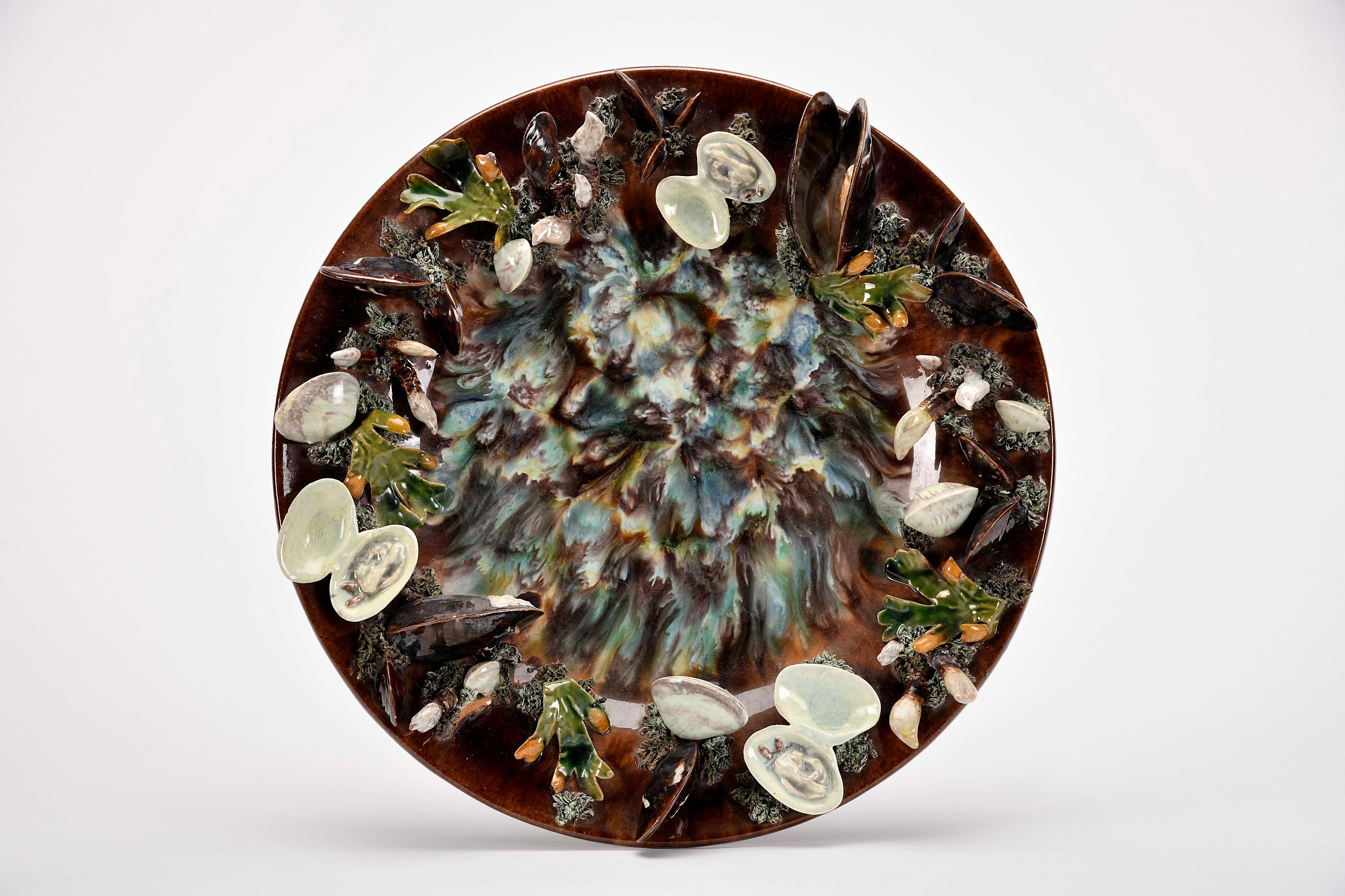 Prato decorativo de suspensão - Crustáceos faiança das Caldas decoração policromada e relevada sobre fundo escorrido um percebe partido e colado, pequenas faltas e pequenos restauros modelo de Rafael Bordallo Pinheiro (1884-1905), marca da Fábrica de Faianças das Caldas da Rainha (1884-1908) sob direcção artística de Rafael Bordallo Pinheiro (1884-1905), datado de 1900 Dimensões (altura x comprimento x largura) - 43 cm Notas: exemplar semelhante integrou a colecção Maldonado de Freitas - vd. “A louça das Caldas na colecção de faiança Maldonado de Freitas”. Caldas da Rainha: Câmara Municipal das Caldas da Rainha, 2005, p. 156.