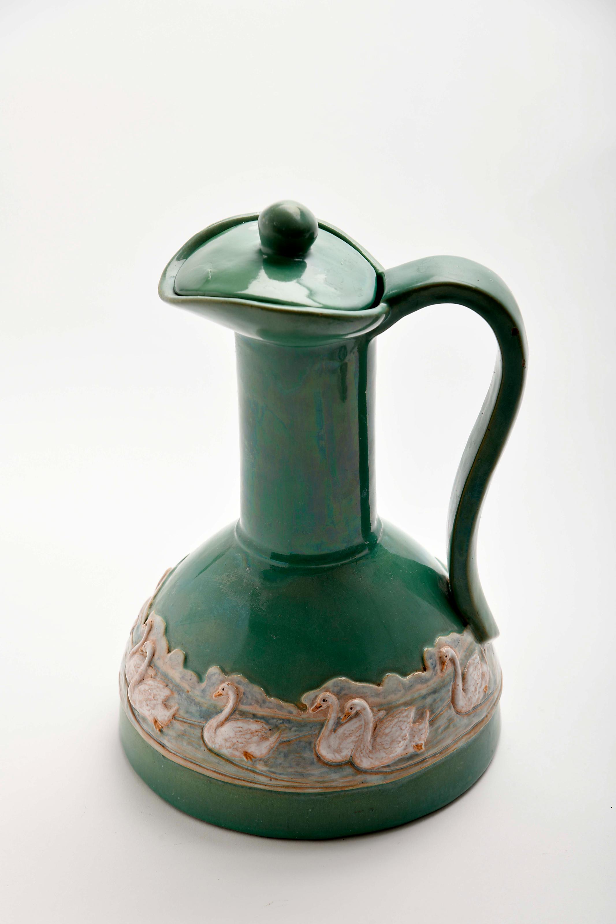 Bilha - frisos de patos faiança das Caldas friso com decoração relevada e policromada sobre fundo verde restauro na tampa modelo de Manuel Gustavo Bordallo Pinheiro (1867-1920), marca da Fábrica Bordallo Pinheiro sob direcção artística de Manuel Gustavo Bordallo Pinheiro (1908-1920), marcada K (1905) [SIC] Dimensões (altura x comprimento x largura) - 25,4 cm Notas: exemplar idêntico integrou a exposição "Faiança Artística das Caldas da Rainha - 2º exposição de M. Gustavo Bordallo Pinheiro", realizada no Atelier António Maria Cardoso. Lisboa: s./i., 1907, nº 20. Outro exemplar idêntico integrou a "Expo Caldas", realizada no Museu de José Malhoa, Caldas da Rainha. Caldas da Rainha: Museu de José Malhoa, 1977, p. 194, nº 653.