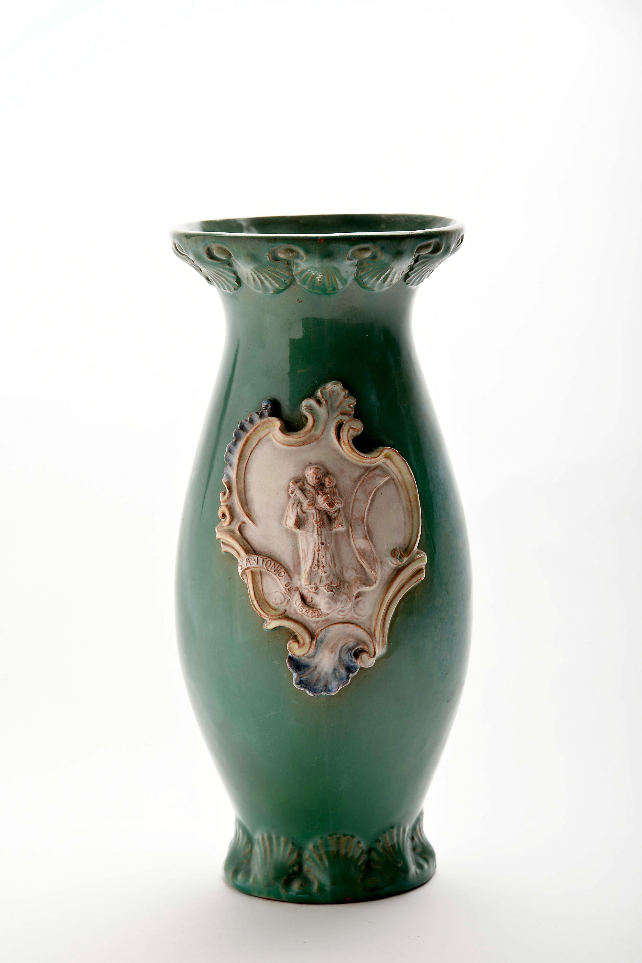 Jarra - Vieiras faiança das Caldas decoração monocroma a verde com medalhão relevado a azul e branco "Santo António com o Menino Jesus" alusivo ao 7º Centenário do Nascimento de Santo António restauro no bordo, falta no vidrado do medalhão, ínfimas esbeiçadelas jarra com modelo de Manuel Gustavo Bordallo Pinheiro (1867-1920), medalhão com modelo de Rafael Bordallo Pinheiro (1884-1905), marca da Fábrica Bordallo Pinheiro sob direcção artística de Manuel Gustavo Bordallo Pinheiro (1908-1920), marcada N (1908) Dimensões (altura x comprimento x largura) - 30 cm Notas: exemplar idêntico integrou a a colecção Maldonado de Freitas - vd. catálogo da exposição "A louça das Caldas na colecção de Faiança Maldonado de Freitas ". Caldas da Rainha: Câmara Municipal das Caldas da Rainha, 2005, p. 166.