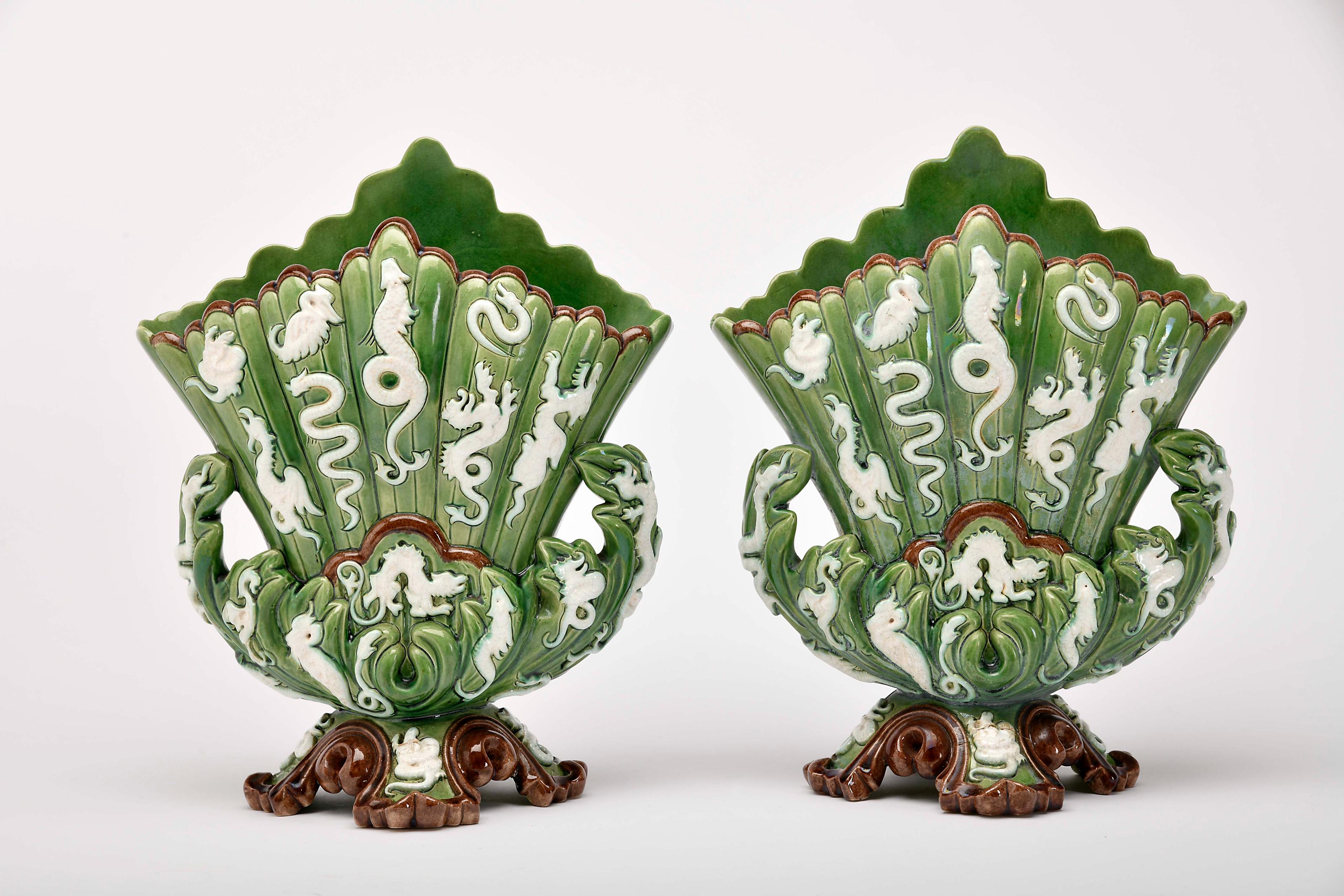 Par de jarras - Folhas faiança das Caldas decoração relevada a branca "Dragões e outros animais fantásticos" sobre fundo em tons de verde com bordos a castanho uma com dois pés partidos e colados, outra com um pé partido e colado Marca da Fábrica de Faianças Artísticas Bordalo Pinheiro Lda. (a partir de 1924) [séc. XX (anos 20/30)], fundo com inscrição MADE IN PORTUGAL Dimensões (altura x comprimento x largura) - 30,5 cm