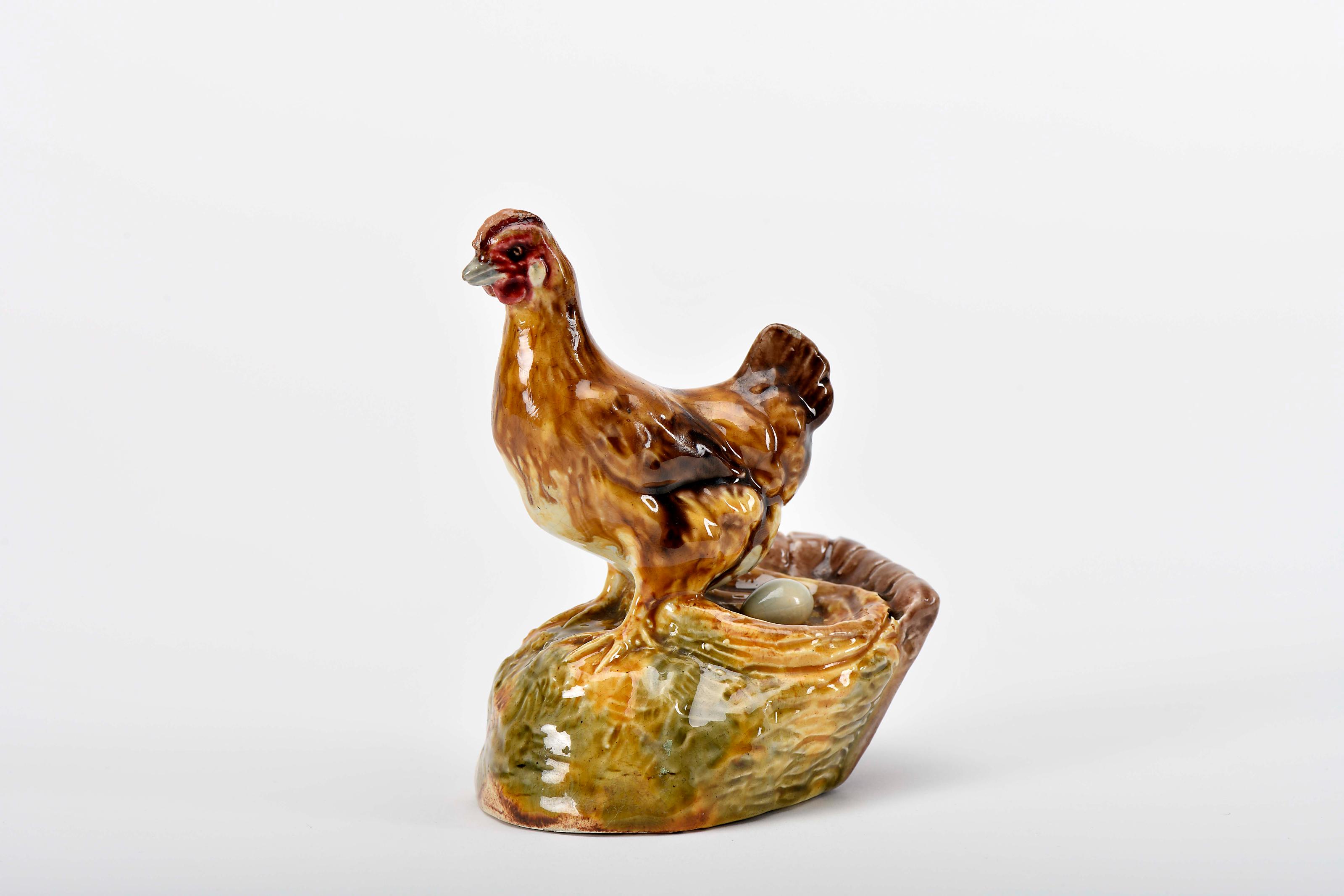Paliteiro - Galinha no ninho faiança das Caldas decoração policromada cabeça restaurada modelo de Rafael Bordallo Pinheiro (1884-1905), marca da Fábrica de Faianças das Caldas da Rainha sob direcção artística de Manuel Gustavo Bordallo Pinheiro (1905-1908), datada de 1908 Dimensões (altura x comprimento x largura) - 11 cm Notas: integrou a colecção de Joaquim Ladeira Baptista.