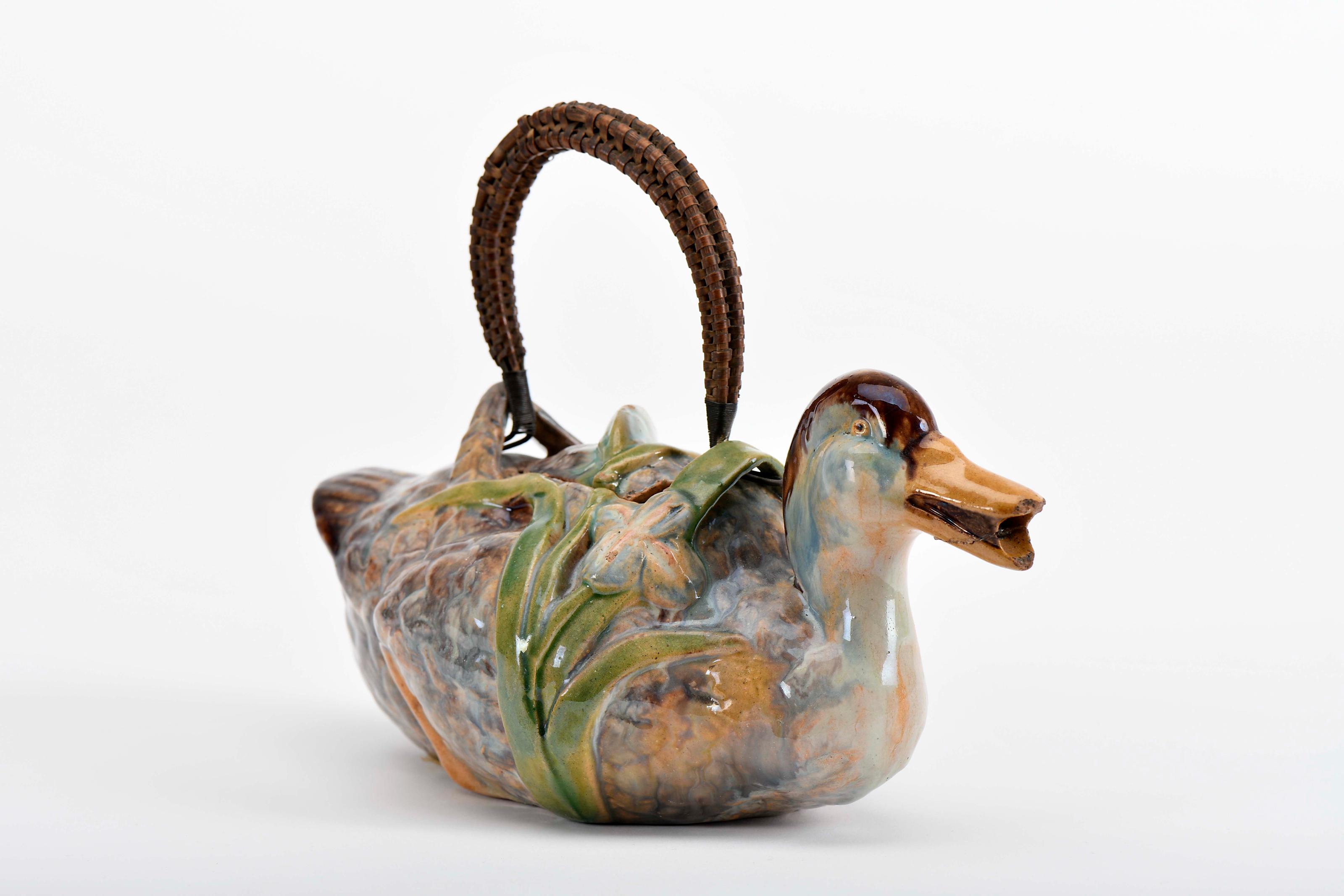 Bule - Pato faiança das Caldas decoração policromada, pega em verga bico partido, colado e restaurado, cauda com pequena esbeiçadela modelo de Rafael Bordallo Pinheiro (1884-1905), marca da Fábrica de Faianças das Caldas da Rainha (1884-1908), sob direcção artística de Rafael Bordallo Pinheiro (1884-1905) Dimensões (altura x comprimento x largura) - 17 x 23 cm Notas: integrou a colecção de Joaquim Ladeira Baptista.Exemplar idêntico integra a colecção do Museu Rafael Bordalo Pinheiro, Lisboa, com o nº de Inv. 699 - vd. catálogo da exposição "Faianças de Rafael Bordalo Pinheiro". Lisboa: Câmara Municipal de Lisboa, 1985, p. 135, nº 297.