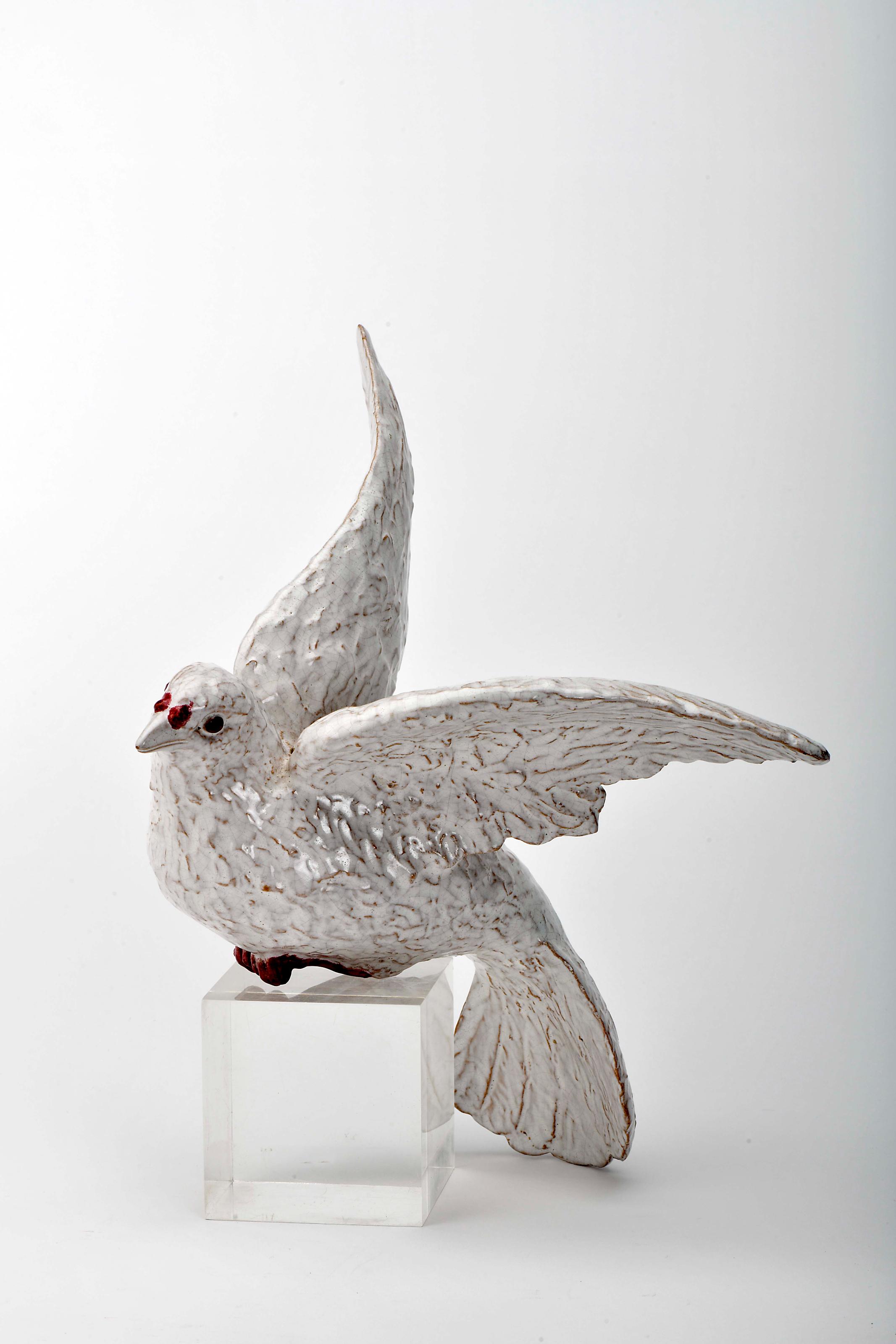 Escultura de suspensão - Pomba voando faiança das Caldas decoração policromada pequenas faltas no vidrado modelo de Rafael Bordallo Pinheiro (1884-1905), marca da Fábrica de Faianças das Caldas da Rainha (1884-1908) sob direcção artística de Rafael Bordallo Pinheiro (1884-1905), datada de 1904 Dimensões (altura x comprimento x largura) - 32 cm Notas: integrou a colecção de Joaquim Ladeira Baptista.Exemplar idêntico encontra-se em exposição no Museu de José Malhoa, Caldas da Rainha, suspensa do tecto, da autoria de Rafael Bordallo Pinheiro.Outro exemplar idêntico integra a colecção do Museu Rafael Bordalo Pinheiro, Lisboa, Inv. nº 965. - Vd. catálogo da exposição "Faianças de Rafael Bordalo Pinheiro". Lisboa: Câmara Municipal de Lisboa, 1985, p. 71, nº 112.