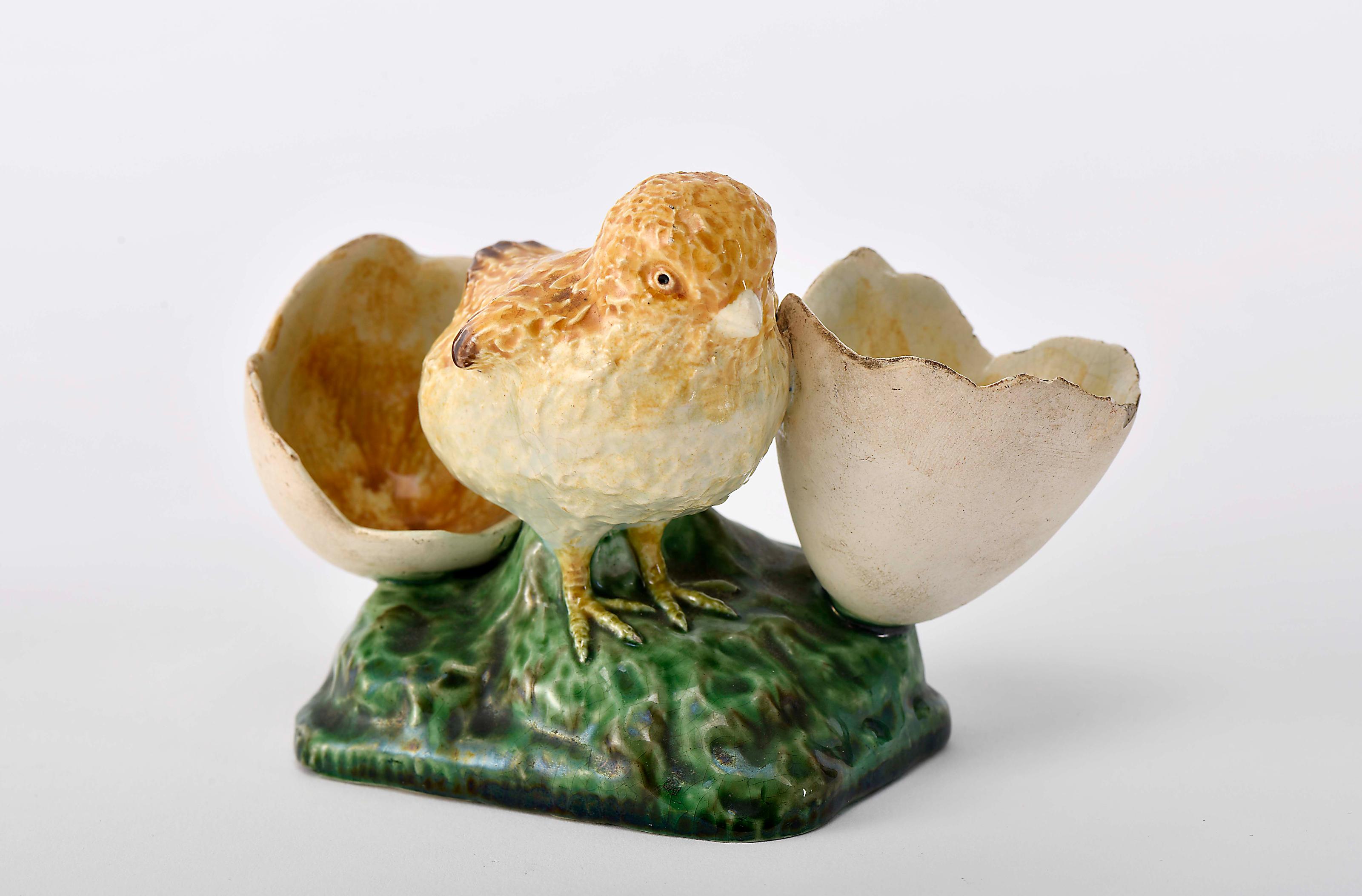 Escultura - Pintainho e casca de ovo faiança das Caldas parcialmente não vidrada decoração policromada pequenas esbeiçadelas nos bordos da casca de ovo modelo de Manuel Gustavo Bordallo Pinheiro (1907-1920), marca da Fábrica Bordallo Pinheiro sob direcção artística de Manuel Gustavo Bordallo Pinheiro (1908-1920), marcada V (1916) Dimensões (altura x comprimento x largura) - 8,5 x 12,4 x 7 cm