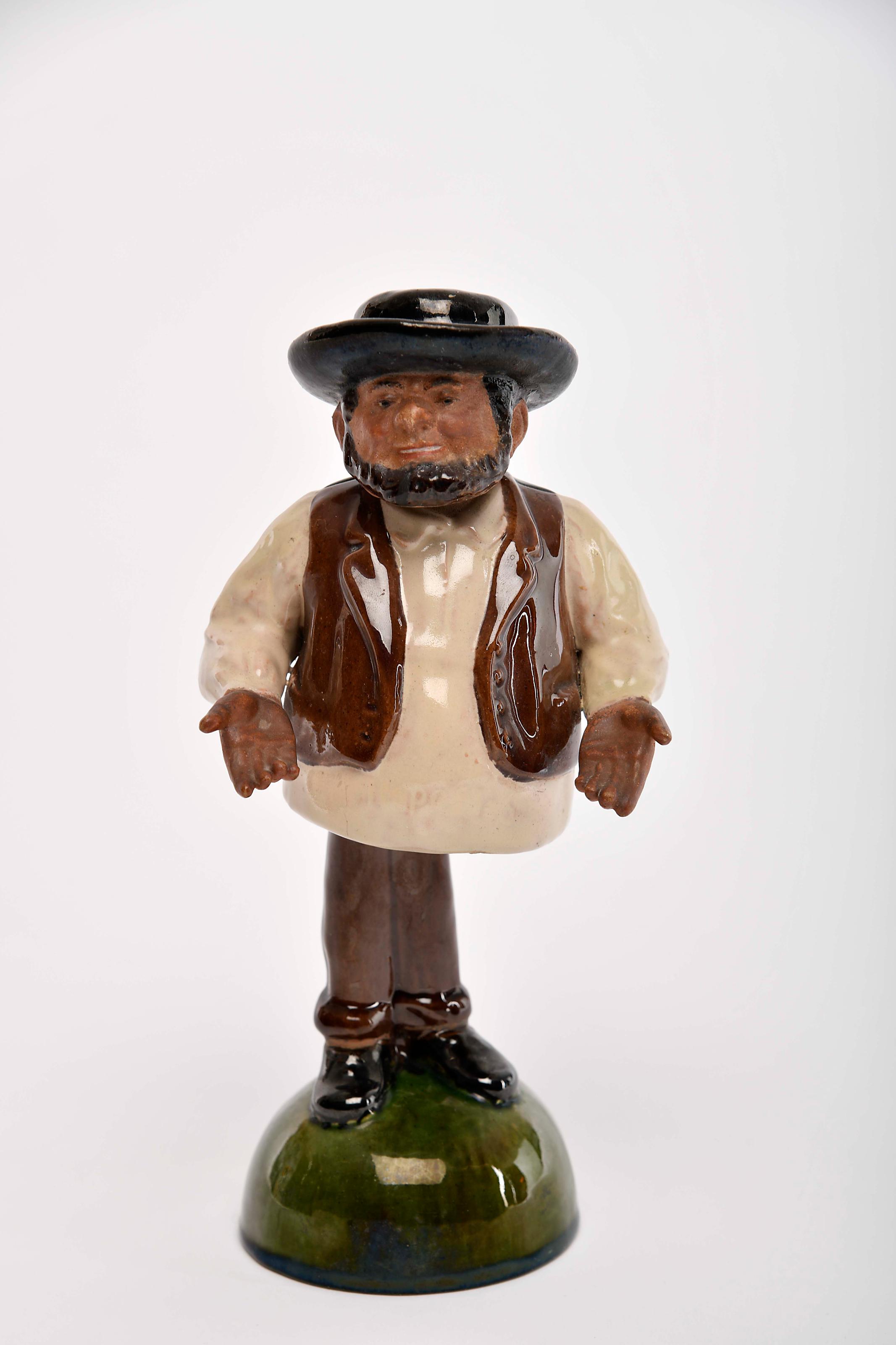 Figura de movimento - Zé Povinho faiança das Caldas parcialmente não vidrada decoração policromada, inscrição IMPOSTOS ínfimas faltas no vidrado modelo de Rafael Bordallo Pinheiro (1884-1905), marca da Fábrica Bordallo Pinheiro sob direcção artística de Manuel Gustavo Bordallo Pinheiro (1908-1920), marcada R (1912) Dimensões (altura x comprimento x largura) - 23,3 cm Notas: exemplar idêntico integra a colecção do Museu de Cerâmica das Caldas da Rainha - Inv. nº 232 - vd. “Rafael Bordalo Pinheiro e a Fábrica de Faianças das Caldas da Rainha (1884-1905)”. Caldas da Rainha: Instituto Português de Museus / Museu de Cerâmica, 2005, p. 172, nº 104.
