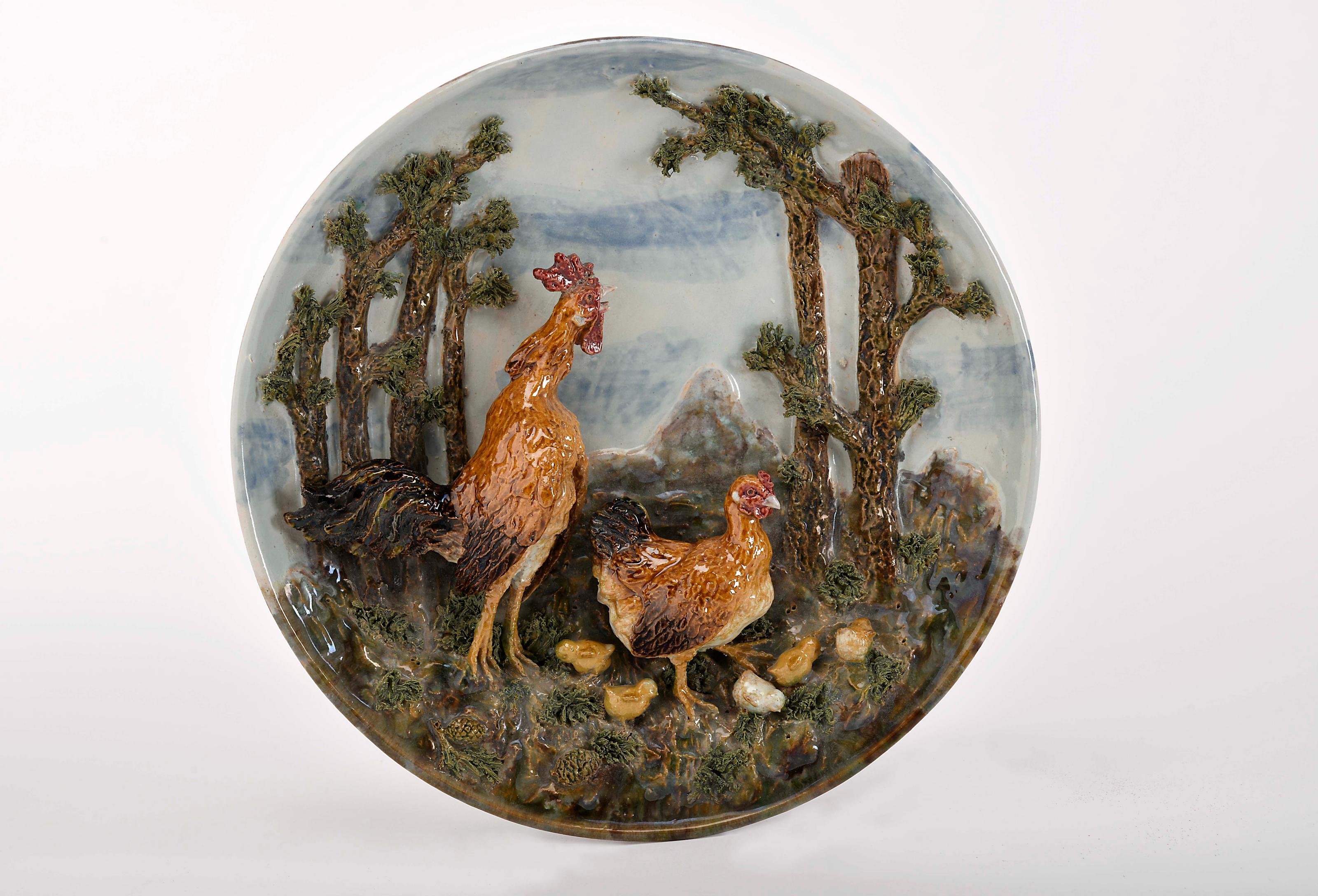 Prato decorativo de suspensão - Galo e galinha faiança das Caldas decoração relevada e policromada com fundo parcialmente musgado colagem na crista do galo modelo de Rafael Bordallo Pinheiro (1884-1905), marca da Fábrica de Faianças das Caldas da Rainha (1884-1908), sob direcção artística de Rafael Bordallo Pinheiro (1884-1905), datado de 1905 Dimensões (altura x comprimento x largura) - 27,9 cm Notas: exemplar idêntico integrou a exposição “Faiança Artística das Caldas da Rainha - Modelos de Raphael Bordallo Pinheiro e M. Gustavo Bordallo Pinheiro”. Lisboa: s./i., 1911, p. 27.; outros exemplar exemplar idêntico integra a colecção do Museu Rafael Bordalo Pinheiro, Lisboa - Inv. nº 918 - vd. catálogo da exposição “Faianças de Rafael Bordalo Pinheiro”. Lisboa: Câmara Municipal de Lisboa, 1985, p. 70, nº 109.