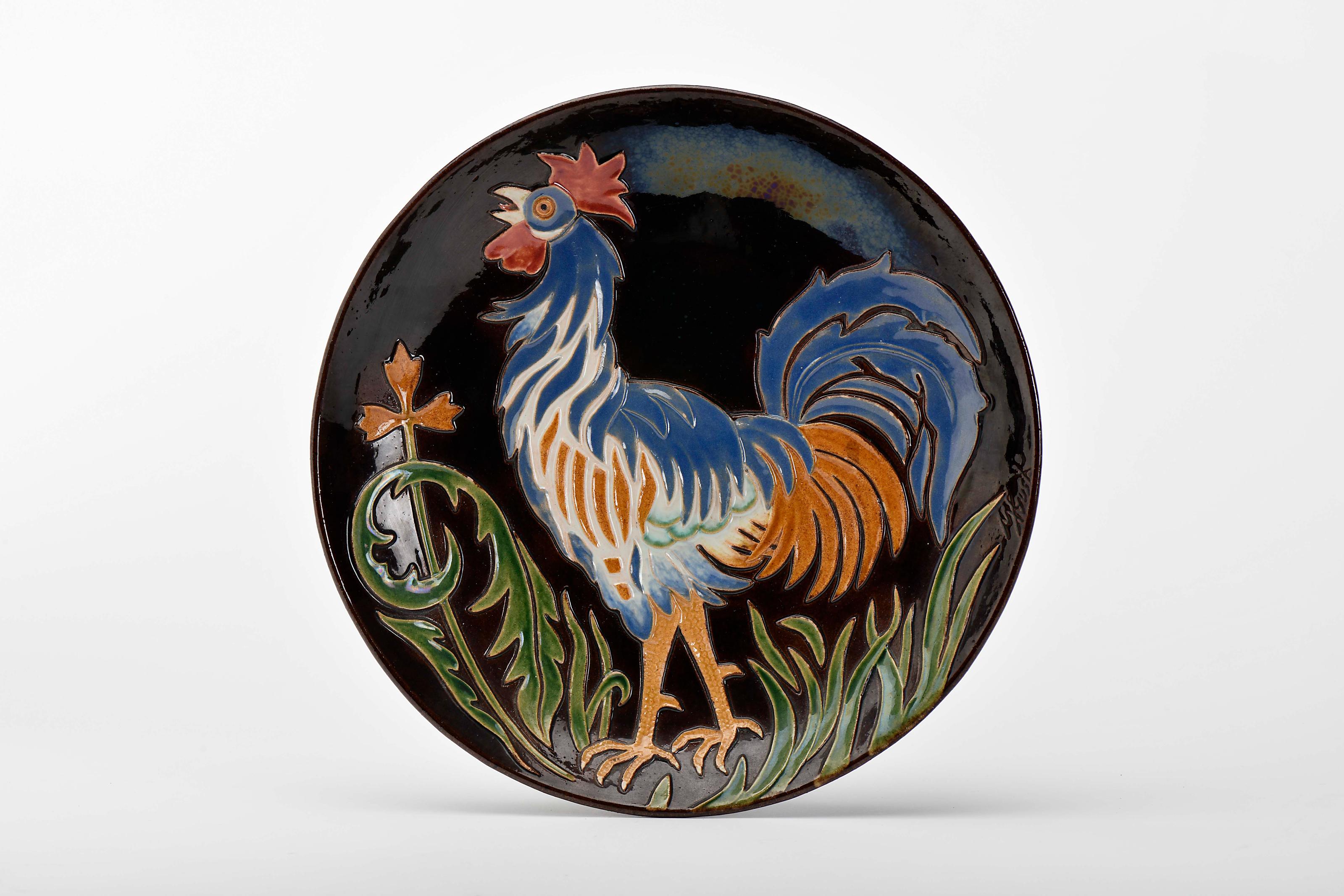 Prato decorativo de suspensão"Galo ingénuo" faiança das Caldas decoração relevada e policromada Manuel Gustavo Bordallo Pinheiro (1867-1920), modelo de (1907-1920), marca da Fábrica Bordallo Pinheiro sob direcção artística de Manuel Gustavo Bordallo Pinheiro (1908-1920), marcado A (1895) [SIC] Dimensões (altura x comprimento x largura) - 27,5 cm Notas: integrou a colecção de Joaquim Ladeira Baptista.exemplar idêntico, com policromia diferente, integrou a exposição. "Faiança Artística das Caldas da Rainha - 3ª Exposição de M. Gustavo Bordallo Pinheiro", realizada no Atelier de António Maria Cardoso. Lisboa: Typ. Lallemand, 1909, s/n., imagem "Pratos de relevo".
