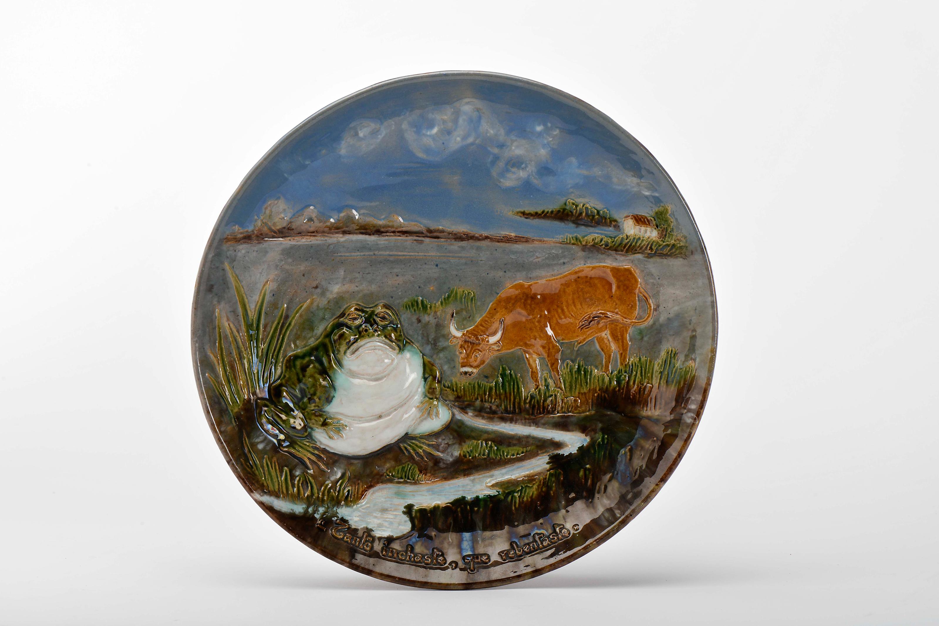 Prato decorativo de suspensão - O boi e a rã (Fábulas de La Fontaine) faiança das Caldas decoração relevada e policromada com inscrição TANTO INCHASTE QUE REBENTASTE ligeiras esbeiçadelas no castigo modelo de Manuel Gustavo Bordallo Pinheiro (1867-1920), marca da Fábrica Bordallo Pinheiro sob direcção artística de Manuel Gustavo Bordallo Pinheiro (1908-1920), marcado F (1900) [SIC] Dimensões (altura x comprimento x largura) - 27 cm Notas: referido no catálogo "Faiança artistica das Caldas da rainha" - 5ª Exposição de Modelos de M. Gustavo Bordallo Pinheiro. Caldas da Rainha: Fabrica Bordallo Pinheiro «San Rafael»", 1913, nº 33.integrou a colecção de Joaquim Ladeira Baptista.Prato com fábula de La Fontaine diferente integrou a colecção Maldonado de Freitas - vd. catálogo da exposição "A louça das Caldas na Colecção de Faiança Maldonado de Freitas". Caldas da Rainha: Câmara Municipal das Caldas da Rainha, 2005, p. 166.