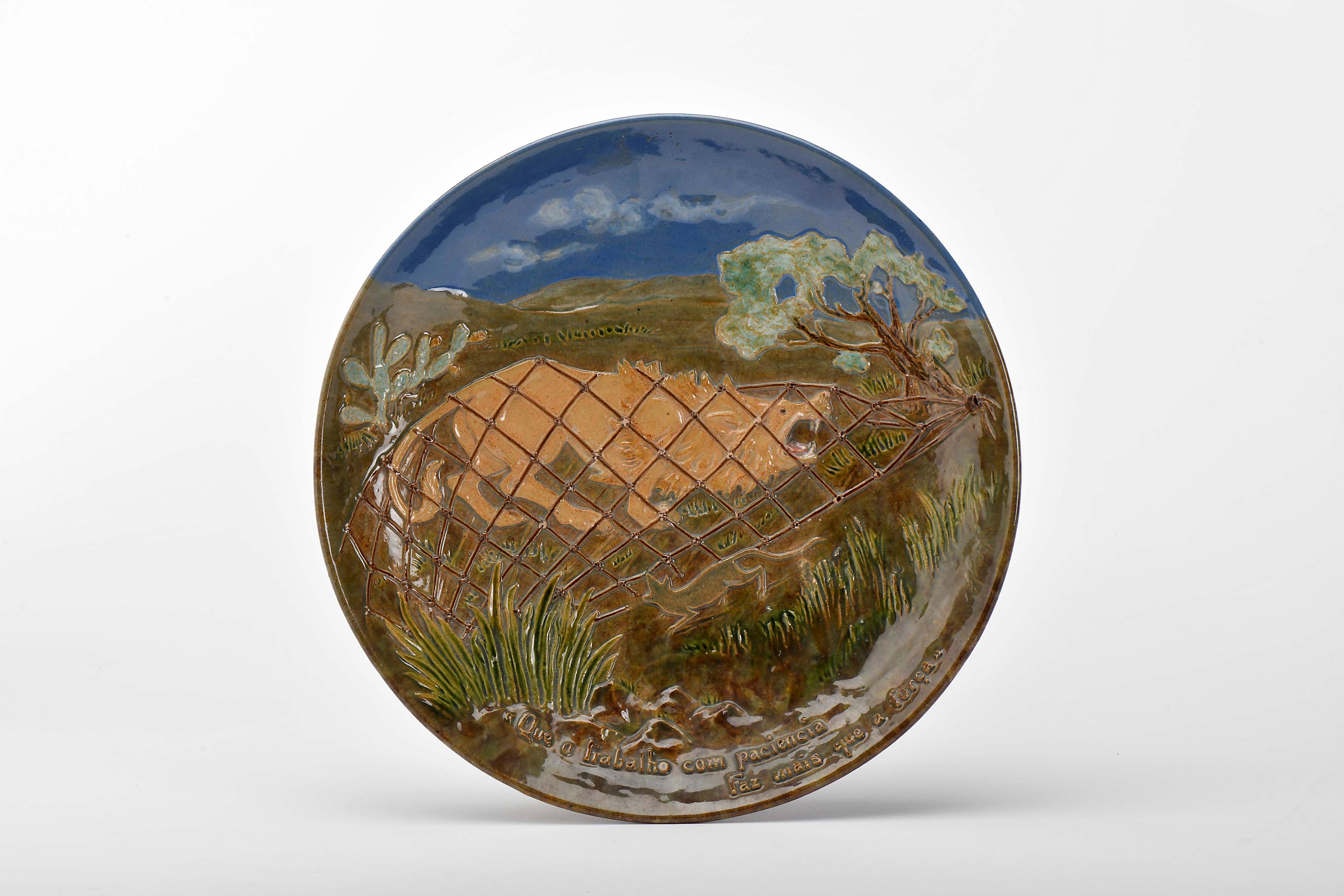 Prato decorativo de suspensão - O leão e o rato (Fábulas de La Fontaine) faiança das Caldas decoração relevada e policromada com inscrição QUE O TRABALHO COM PACIÊNCIA FAZ MAIS QUE A FORÇA ínfimas esbeiçadelas na rede modelo de Manuel Gustavo Bordallo Pinheiro (1867-1920), marca da Fábrica Bordallo Pinheiro sob direcção artística de Manuel Gustavo Bordallo Pinheiro (1908-1920), marcado F (1900) [SIC] Dimensões (altura x comprimento x largura) - 27 cm Notas: integrou a colecção de Joaquim Ladeira Baptista, tendo integrado anteriormente a colecção Maldonado de Freitas, com o nº 1385, conforme inscrição manuscrita no verso.Referido no catálogo "Faiança artistica das Caldas da rainha" - 5ª Exposição de Modelos de M. Gustavo Bordallo Pinheiro. Caldas da Rainha: Fabrica Bordallo Pinheiro «San Rafael»", 1913, nº 301.Outro prato com fábula de La Fontaine diferente integrou a colecção de faiança Maldonado de Freitas - vd. catálogo da exposição "A louça das Caldas na colecção de faiança Maldonado de Freitas ". Caldas da Rainha: Câmara Municipal das Caldas da Rainha, 2005, p. 166.