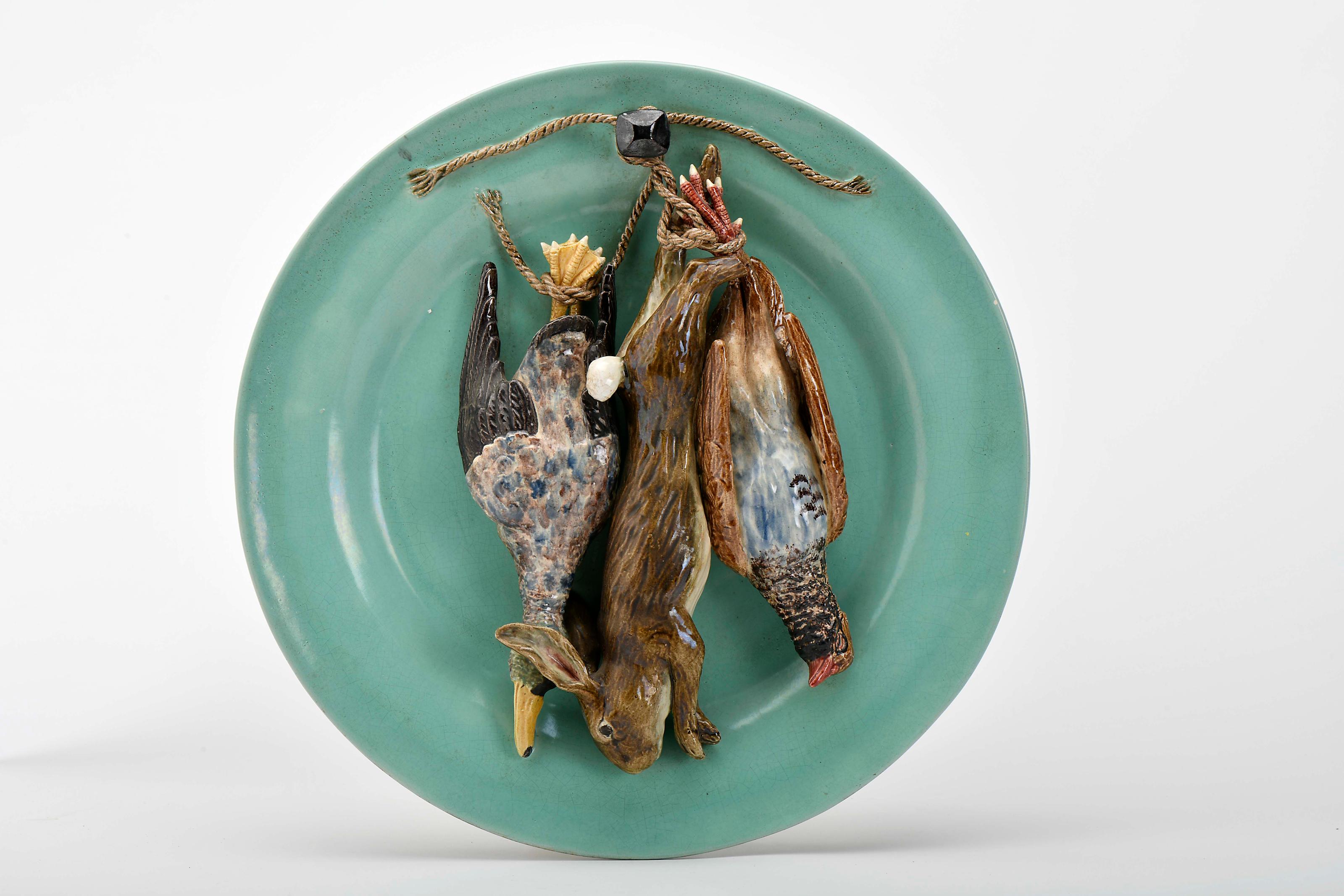 Prato decorativo de suspensão "Caça" faiança das Caldas decoração policromada e relevada sobre fundo azul falta de parte de uma pata e pequena esbeiçadela na orelha do coelho modelo de Rafael Bordallo Pinheiro (1884-1905), Fábrica de Faianças Artísticas Bordalo Pinheiro Lda. (a partir de 1924), verso com inscrição MADE IN PORTUGAL Dimensões (altura x comprimento x largura) - 35,5 cm Notas: exemplar semelhante integrou a colecção Maldonado de Freitas - vd. catálogo da exposição "A louça das Caldas na colecção de faiança Maldonado de Freitas ". Caldas da Rainha: Câmara Municipal das Caldas da Rainha, 2005, p. 168.