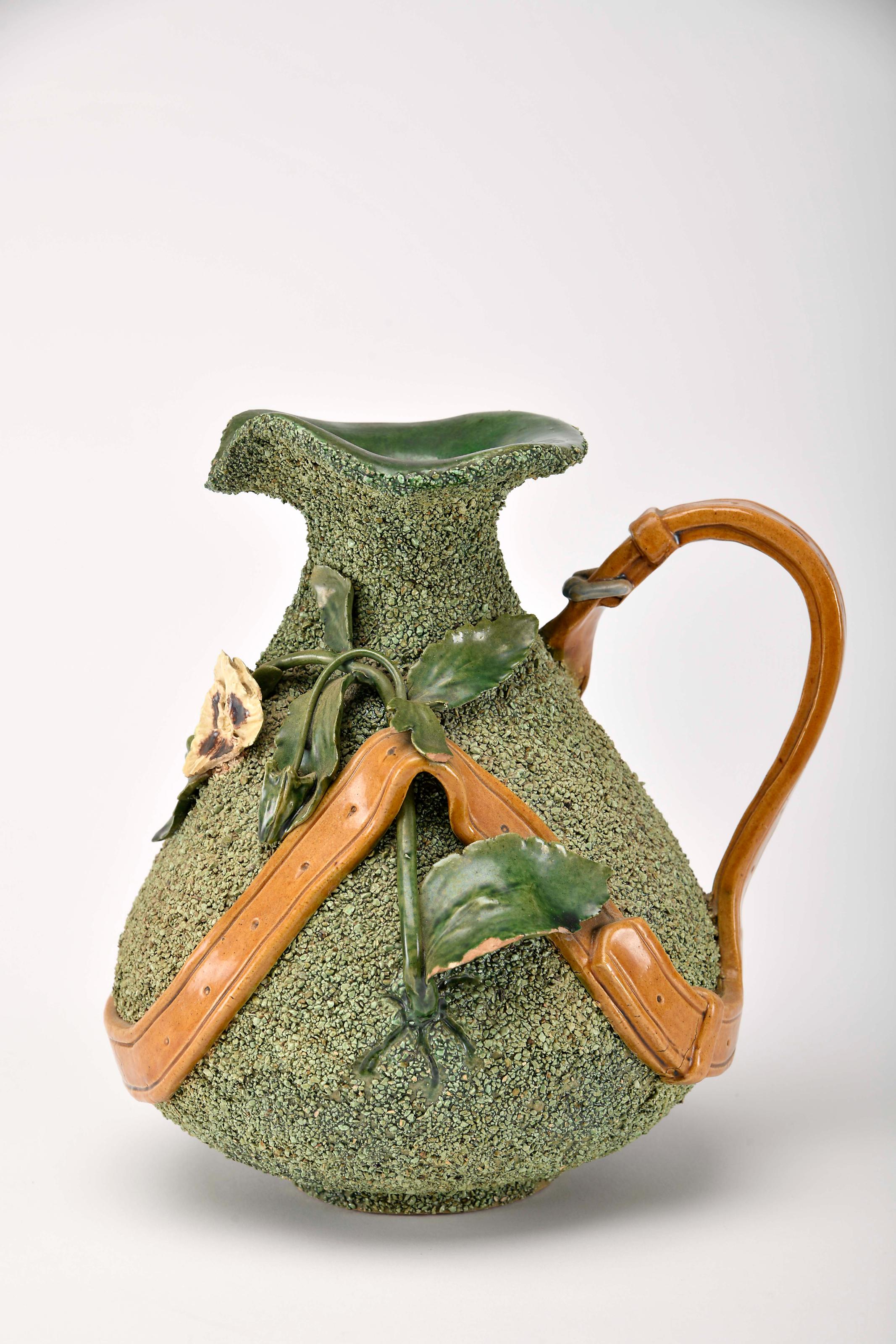 Canjirão - Amor Perfeito faiança das Caldas decoração relevada e policromada sobre fundo areado, pega e precinta em forma de cinto de couro falta da tampa, pequena falta numa flor, esbeiçadela numa folha modelo de Rafael Bordallo Pinheiro (1884-1905), marca da Fábrica de Faianças das Caldas da Rainha (1884-1908) sob direcção artística de Manuel Gustavo Bordallo Pinheiro (1905-1908), datado de 1906 Dimensões (altura x comprimento x largura) - 21,5 cm Notas: exemplar semelhante integra a colecção do Museu de Cerâmica das Caldas da Rainha - Inv. nº 150 - vd. "Rafael Bordalo Pinheiro e a Fábrica de Faianças das Caldas da Rainha 1884-1905". Caldas da Rainha: Instituto Português de Museus / Museu de Cerâmica, 2005, p. 147, nº 57.