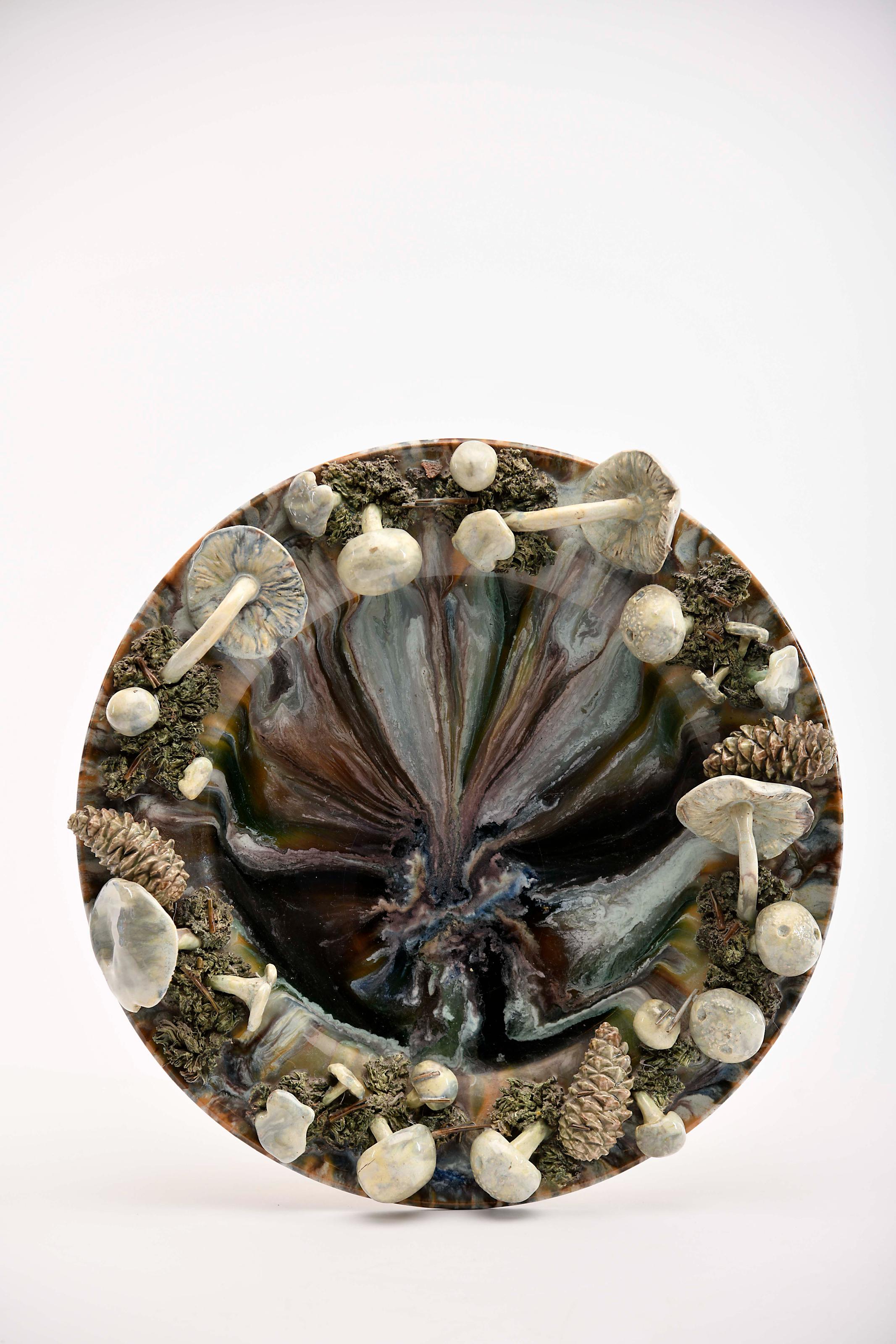 Prato decorativo de suspensão - Cogumelos, pinhas e musgo faiança das Caldas decoração relevada e policromada sobre fundo «escorrido» em tons de azul e castanho, aba sobre fundo musgoso faltas nas ramagens, castigo com grandes esbeiçadelas, outras pequenas faltas modelo de Rafael Bordallo Pinheiro (1884-1905), marca da Fábrica de Faianças das Caldas da Rainha (1884-1908) sob direcção artística de Rafael Bordallo Pinheiro (1884-1905), datado de 1887 Dimensões (altura x comprimento x largura) - 41,5 cm