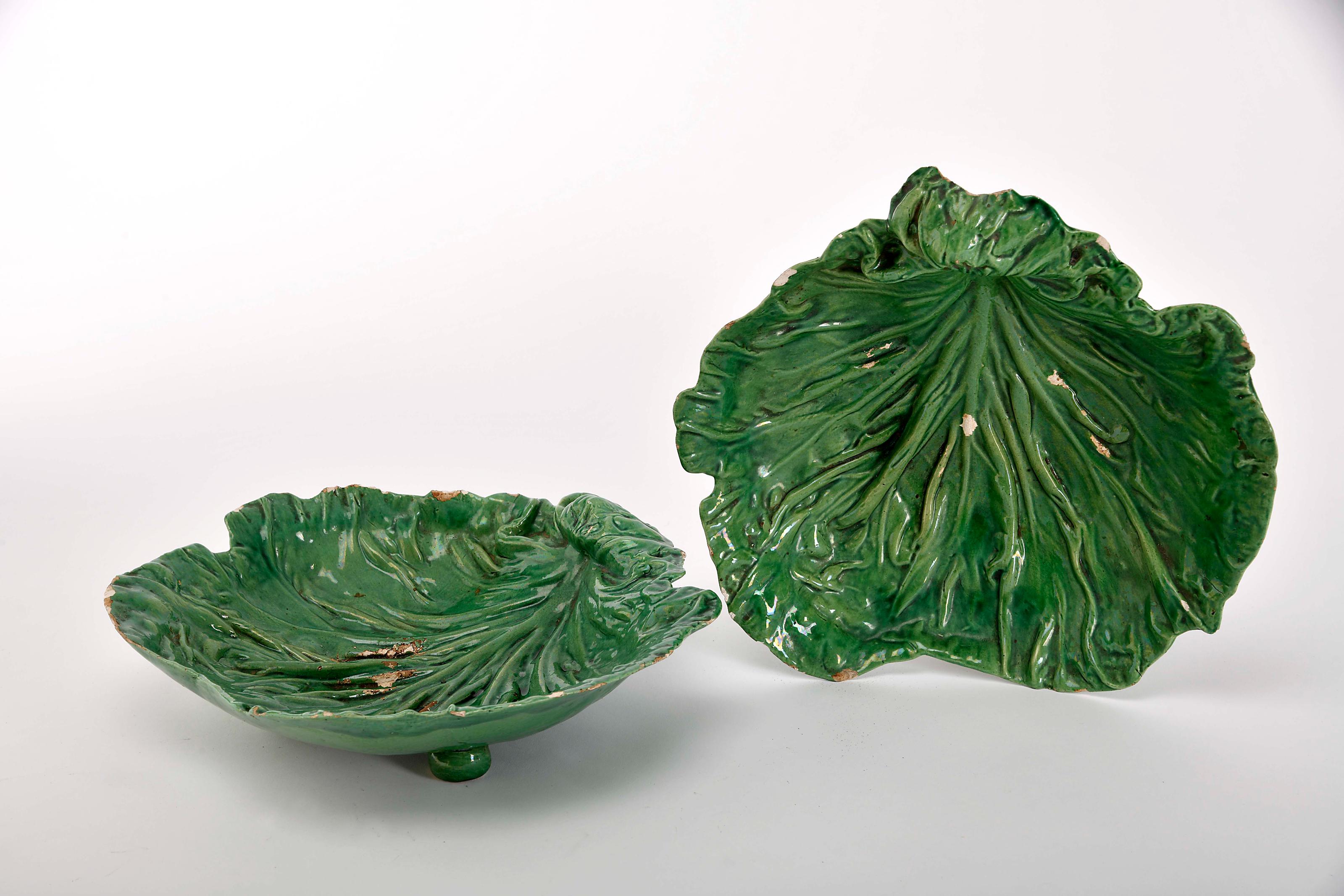Par de taças - Folha de couve faiança das Caldas decoração relevada monocroma a verde defeitos de fabrico no vidrado, pequenas faltas e esbeiçadelas nos bordos modelo de Rafael Bordallo Pinheiro (1884-1905), marca da Fábrica Bordallo Pinheiro sob direcção artística de Manuel Gustavo Bordallo Pinheiro (1908-1920) Dimensões (altura x comprimento x largura) - 6 x 28 cm Notas: exemplar idêntico integra a colecção do Museu Rafael Bordalo Pinheiro, Lisboa - Inv. nº 15 - vd. catálogo da exposição “Faianças de Rafael Bordalo Pinheiro”. Lisboa: Câmara Municipal de Lisboa, 1985, p. 65, nº 91.