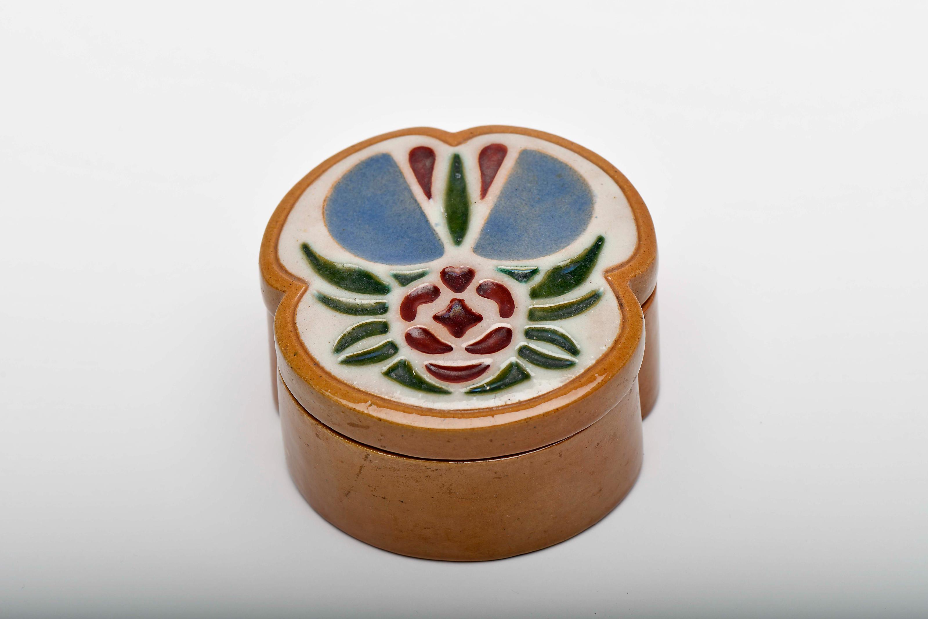 Caixa gomada faiança das Caldas decoração a castanho, tampa relevada a azul, verde, vermelho e branco "Flor" modelo de Manuel Gustavo Bordallo Pinheiro (1867-1920), marca da Fábrica Bordallo Pinheiro sob direcção artística de Manuel Gustavo Bordallo Pinheiro (1908-1920), marcada O (1909) Dimensões (altura x comprimento x largura) - 5,2 x 9,2 x 9,2 cm