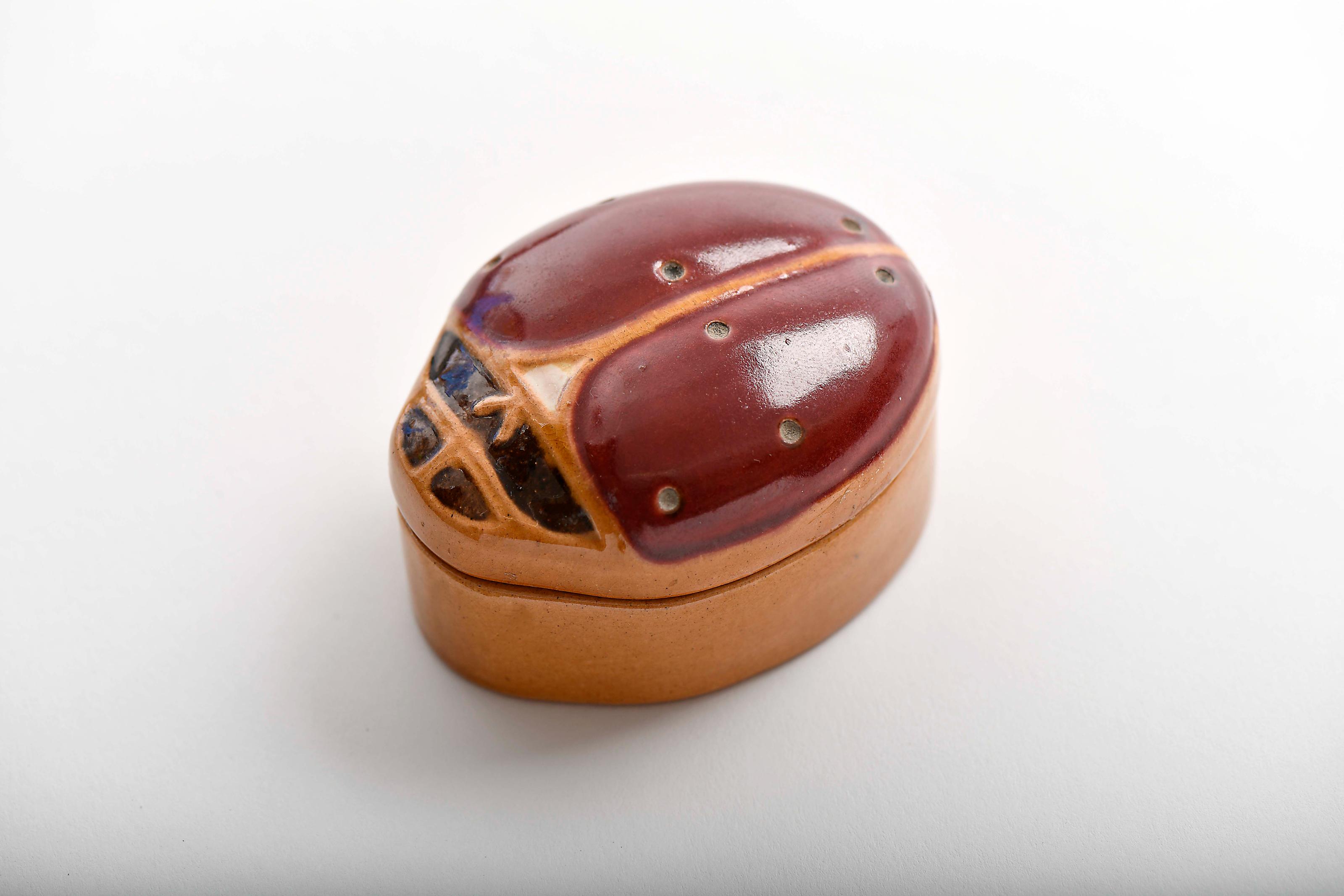 Caixa - Joaninha faiança das Caldas decoração a castanho, tampa relevada a vermelho, castanho e branco modelo de Manuel Gustavo Bordallo Pinheiro (1867-1920), marca da Fábrica Bordallo Pinheiro sob direcção artística de Manuel Gustavo Bordallo Pinheiro (1908-1920), marcada V (1916) Dimensões (altura x comprimento x largura) - 4,3 x 7,3 x 5,5 cm