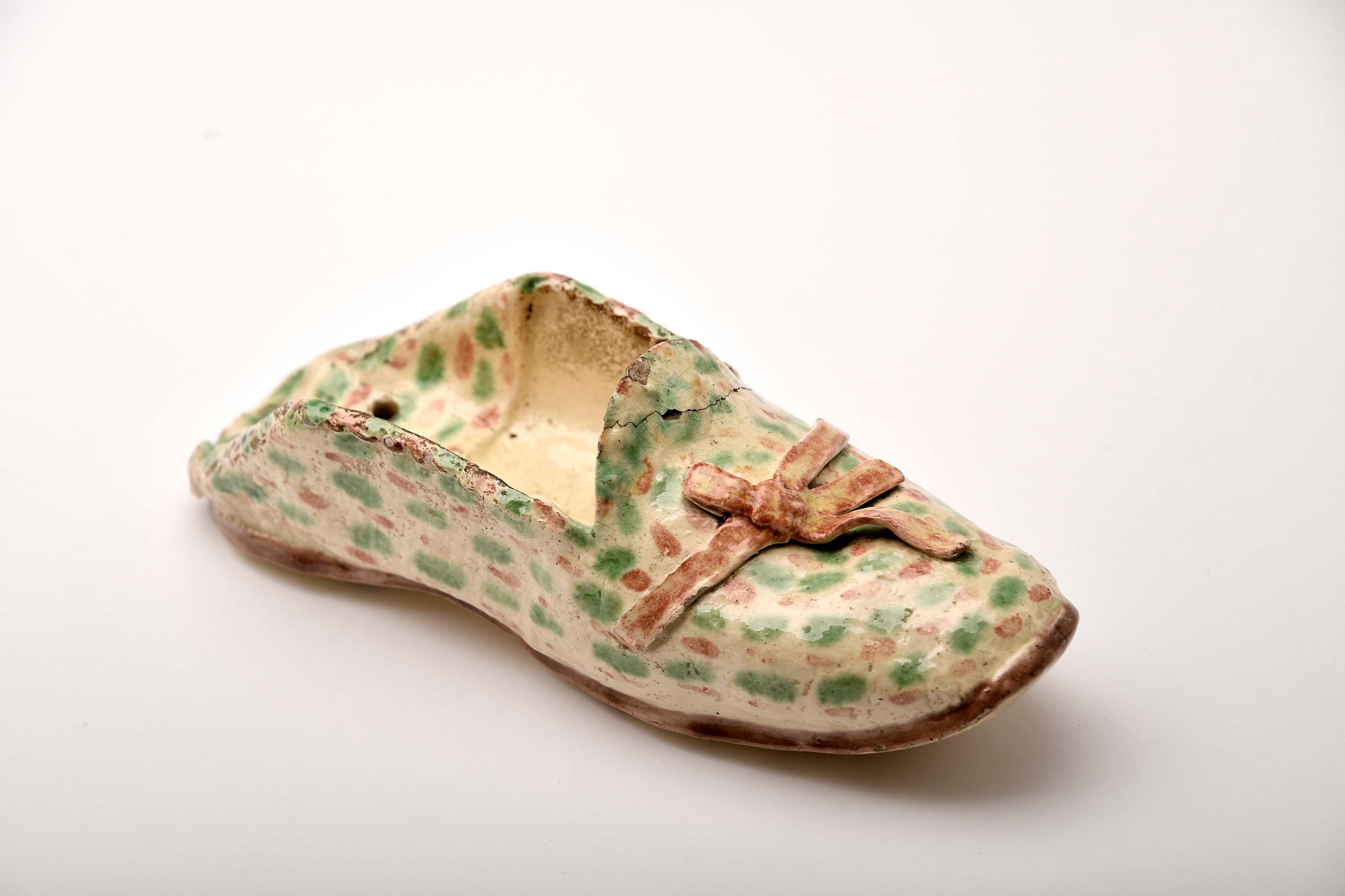 Floreira de suspensão - Sapato de quarto feminino faiança das Caldas decoração a verde e rosa colagem na pala, pequenas esbeiçadelas modelo de Rafael Bordallo Pinheiro (1884-1905), marca da Fábrica de Faianças das Caldas da Rainha (1884-1908) sob direcção artística de Rafael Bordallo Pinheiro (1884-1905), datada de 1898 Dimensões (altura x comprimento x largura) - 23 x 8 x 8 cm Notas: exemplar semelhante integra a colecção do Museu Rafael Bordalo Pinheiro, Lisboa - Inv. nº 977 - vd. catálogo da exposição "Faianças de Rafael Bordalo Pinheiro". Lisboa: Câmara Municipal de Lisboa, 1985, p. 106, nº 230.