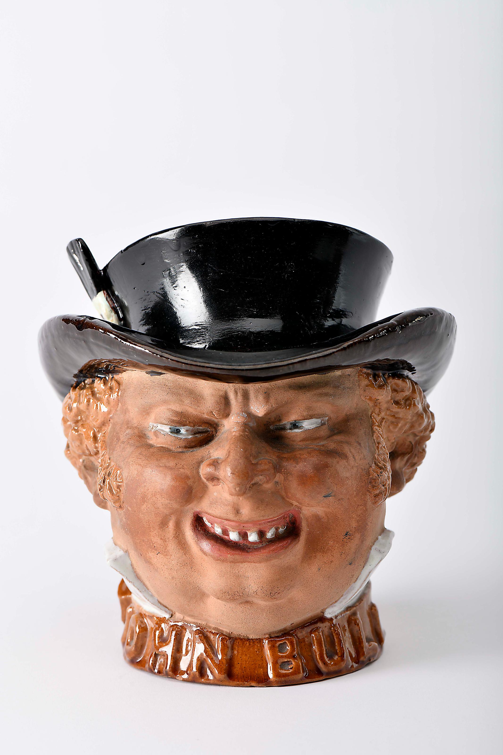 Caixa com tampa - John Bull faiança das Caldas parcialmente não vidrada decoração policromada, base com inscrição JOHN BULL tampa restaurada, outros pequenos restauros na aba do chapéu modelo de Rafael Bordallo Pinheiro (1884-1905), marca da Fábrica de Faianças das Caldas da Rainha (1884-1908) sob direcção artística de Rafael Bordallo Pinheiro (1884-1905), datada de 1898 Dimensões (altura x comprimento x largura) - 17,5 cm Notas: exemplar idêntico integrou a colecção de Faiança Maldonado Freitas. vd. "A louça das Caldas na colecção de faiança Maldonado Freitas". Caldas da Rainha: Câmara Municipal das Caldas da Rainha, 2005, p. 152.