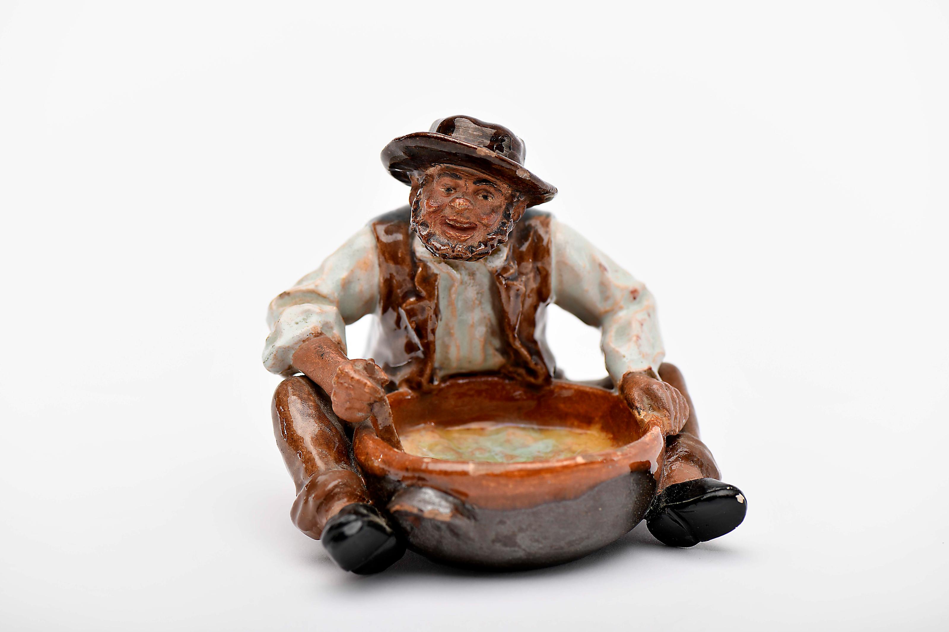 Cinzeiro - Zé Povinho escarranchado num tacho faiança das Caldas parcialmente não vidrada decoração policromada bordo da aba do chapéu com pequenas esbeiçadelas, pequenas faltas no vidrado do alguidar assinada RBP [Rafael Bordallo Pinheiro (1884-1905)] e datada de 1901, modelo de Rafael Bordallo Pinheiro (1884-1905), marca da Fábrica de Faianças das Caldas da Rainha (1884-1908) sob direcção artística de Manuel Gustavo Bordallo Pinheiro (1905-1908), datada de 1906 Dimensões (altura x comprimento x largura) - 9 x 9 x 10,5 cm Notas: exemplar idêntico integrou a colecção Maldonado de Freitas - vd. “A louça das Caldas na colecção de faiança Maldonado de Freitas”. Caldas da Rainha: Câmara Municipal das Caldas da Rainha, 2005, p. 72.