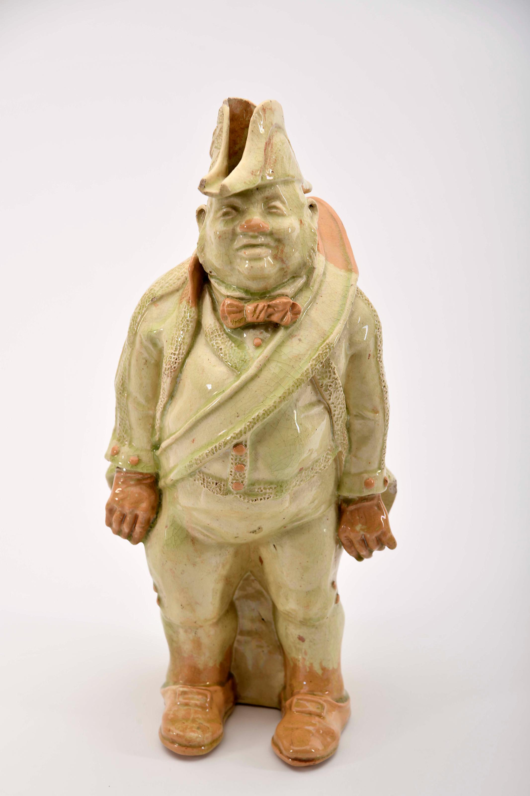Jarro - Archeiro faiança das Caldas decoração em tons de verde e castanho casaco com esbeiçadela modelo de Rafael Bordalo Pinheiro (1846-1905), marca da Fábrica de Faianças das Caldas da Rainha (1884-1908) sob direcção artística de Rafael Bordallo Pinheiro (1884-1905) Dimensões (altura x comprimento x largura) - 37 cm Notas: exemplar idêntico integra a colecção do Museu Rafael Bordalo Pinheiro, Lisboa - Inv. nº 31 - vd. catálogo da exposição "Faianças de Rafael Bordalo Pinheiro". Lisboa: Câmara Municipal de Lisboa, 1985, p. 159, nº 358.