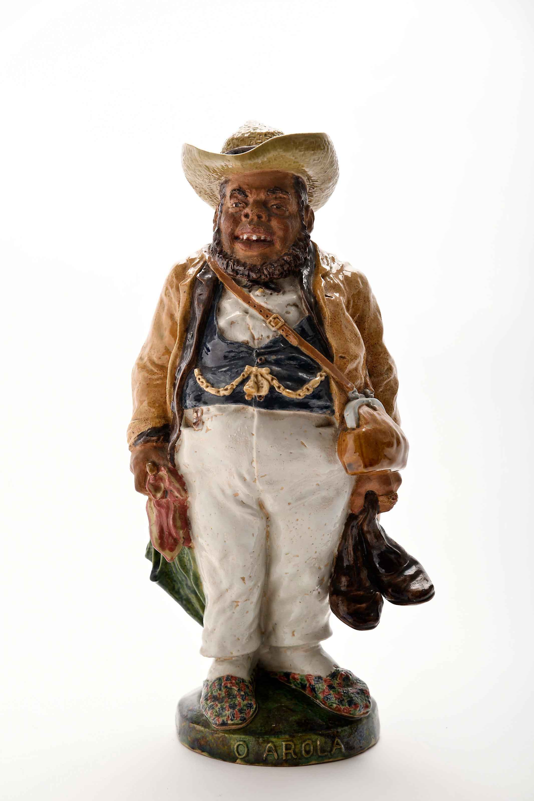 Garrafa "O Arola" faiança das Caldas decoração policromada, base com inscrição O AROLA pequenos restauros, falta e esbeiçadela na tampa, falta no bordo do chapéu modelo de Rafael Bordallo Pinheiro (1884-1905), marca da Fábrica de Faianças das Caldas da Rainha (1884-1908) sob direcção artística de Rafael Bordallo Pinheiro (1884-1905), datada de 1905 Dimensões (altura x comprimento x largura) - 31 cm Notas: integrou a colecção de Joaquim Ladeira Baptista.exemplar idêntico integra a colecção do Museu de Cerâmica das Caldas da Rainha - Inv. nº 212 - vd. "Rafael Bordalo Pinheiro e a Fábrica de Faianças das Caldas da Rainha 1884-1905". Caldas da Rainha: Instituto Português de Museus / Museu de Cerâmica, 2005, p. 170, nº 100.