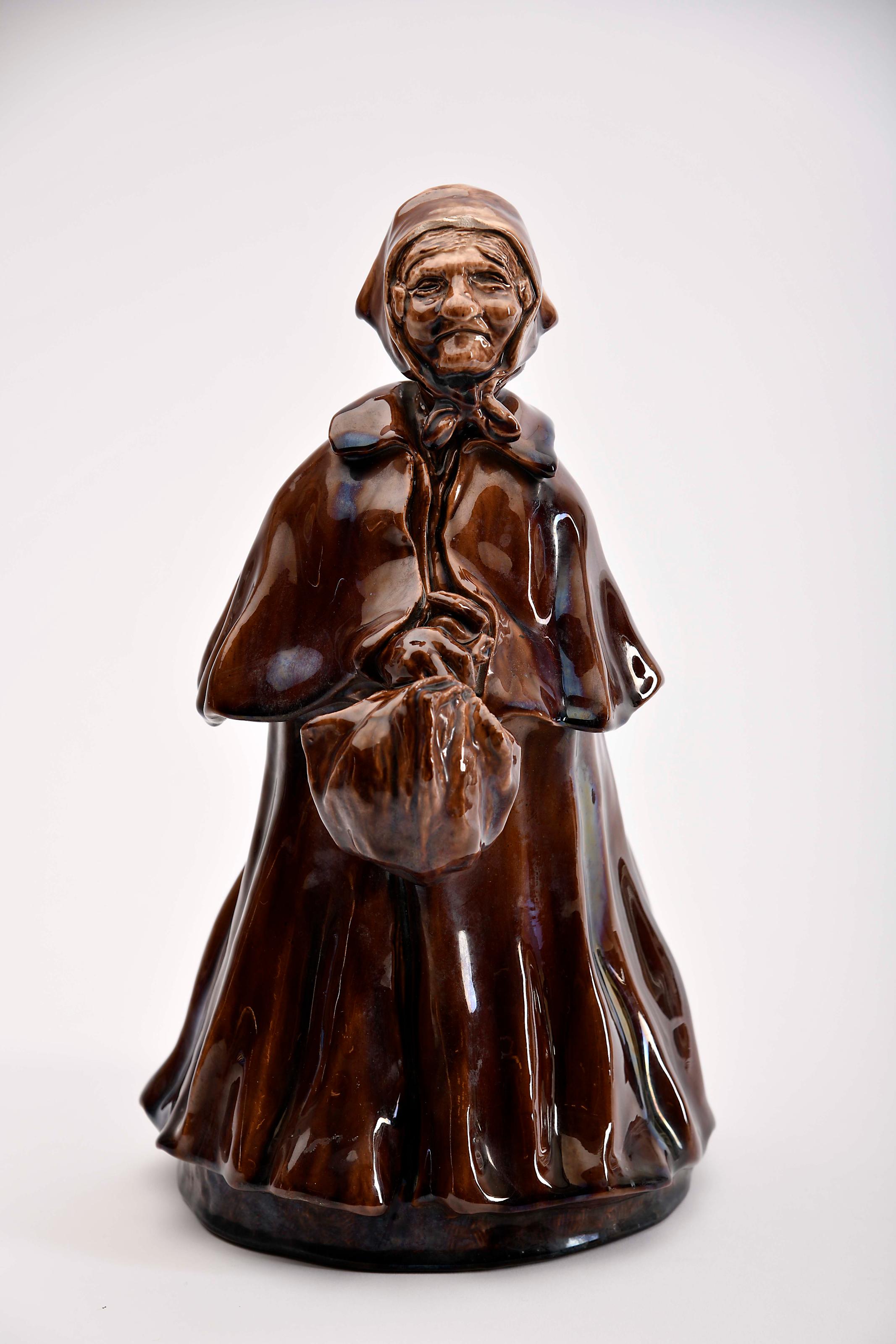 Garrafa - Velha Maria faiança das Caldas decoração em tons de castanho esbeiçadelas no lenço de cabeça modelo de Rafael Bordallo Pinheiro (1884-1905), marca da Fábrica de Faianças das Caldas da Rainha (1884-1908) sob direcção artística de Rafael Bordallo Pinheiro (1884-1905) Dimensões (altura x comprimento x largura) - 32 x 17 cm Notas: exemplar idêntico integra a colecção do Museu Rafael Bordalo Pinheiro, Lisboa - Inv. nº 33 - vd. catálogo da exposição "Faianças de Rafael Bordalo Pinheiro". Lisboa: Câmara Municipal de Lisboa, 1985, p. 160, nº 359.