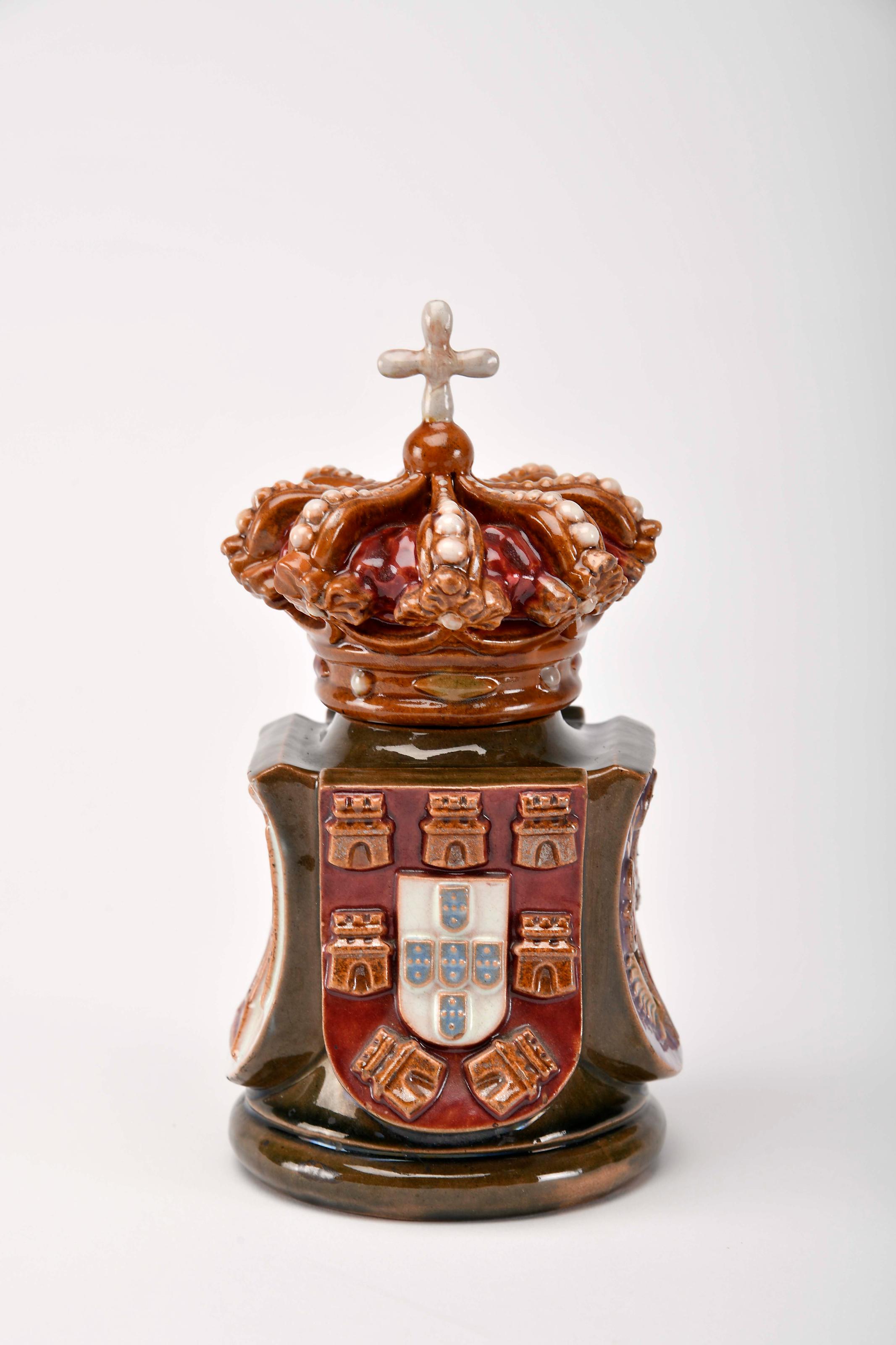Tinteiro - Armas Reaes e Ordens Portuguezas faiança das Caldas decoração relevada e policromada duas pequenas esbeiçadelas modelo de Manuel Gustavo Bordallo Pinheiro (1867-1920), marca da Fábrica Bordallo Pinheiro sob direcção artística de Manuel Gustavo Bordallo Pinheiro (1908-1920) Dimensões (altura x comprimento x largura) - 17 cm Notas: exemplares semelhantes integraram a exposição "Faiança Artística das Caldas da Rainha - 2º exposição de M. Gustavo Bordallo Pinheiro", realizada no Atelier António Maria Cardoso. Lisboa: s. i., 1907, nºs 12 e 14, onde é referido ser uma produção exclusiva para a casa J. LINO, LISBOA.