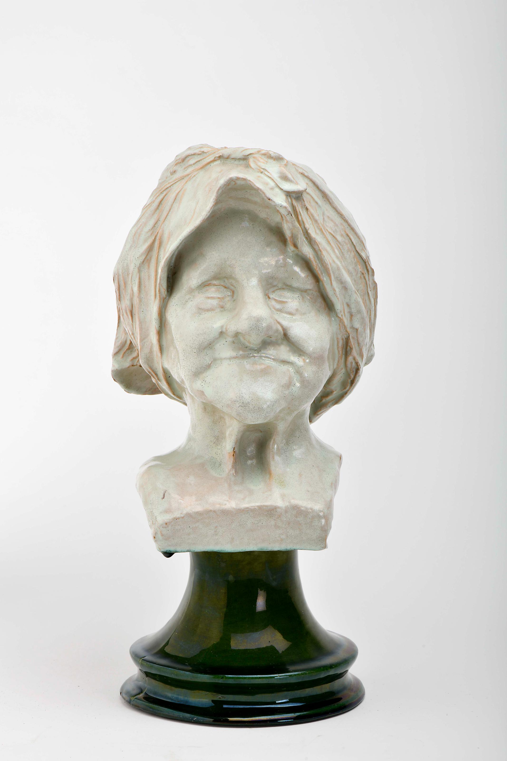 Escultura - Busto de Velha faiança das Caldas decoração a branco com base a verde pequeno restauro na ponta do lenço de cabeça, ligeira esbeiçadela na base modelo tradicionalmente atribuído a Columbano Bordalo Pinheiro (1857-1929), marca da Fábrica de Faianças das Caldas da Rainha (1884-1908) sob direcção artística de Rafael Bordallo Pinheiro (1884-1905) Dimensões (altura x comprimento x largura) - 37,5 cm Notas: exemplar idêntico, parcialmente não vidrado, integra a colecção do Museu de Cerâmica das Caldas da Rainha - Inv. nº 264 - vd. "Rafael Bordalo Pinheiro e a Fábrica de Faianças das Caldas da Rainha 1884-1905". Caldas da Rainha: Instituto Português de Museus / Museu de Cerâmica, 2005, p. 179, nº 122.