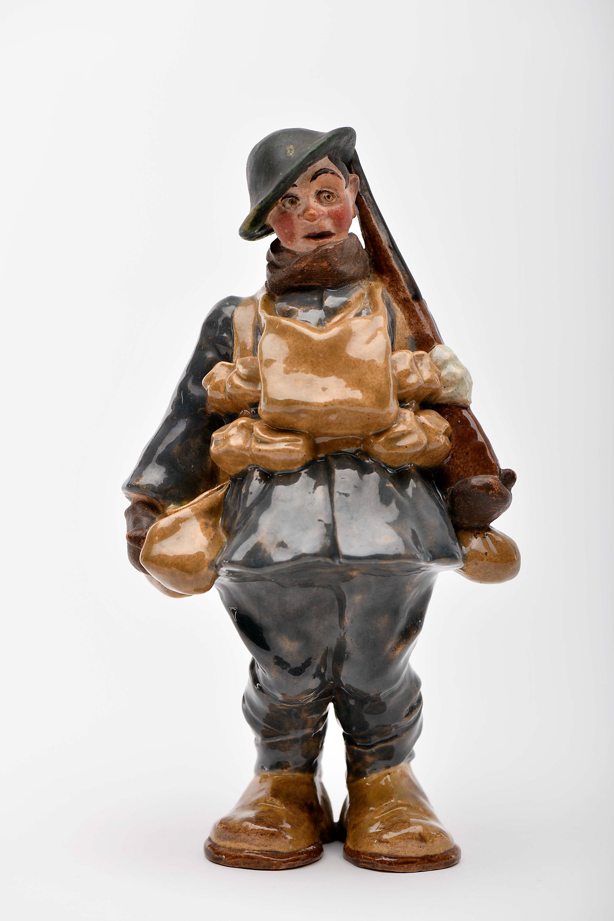 Escultura - Soldado da 1ª Grande Guerra faiança das Caldas parcialmente não vidrada decoração policromada pequenas faltas no vidrado modelo de Vasco Lopes de Mendonça (1883-1963), marca da Fábrica Bordallo Pinheiro sob direcção artística de Manuel Gustavo Bordallo Pinheiro (1908-1920), marcada Y (1919) Dimensões (altura x comprimento x largura) - 24,5 cm