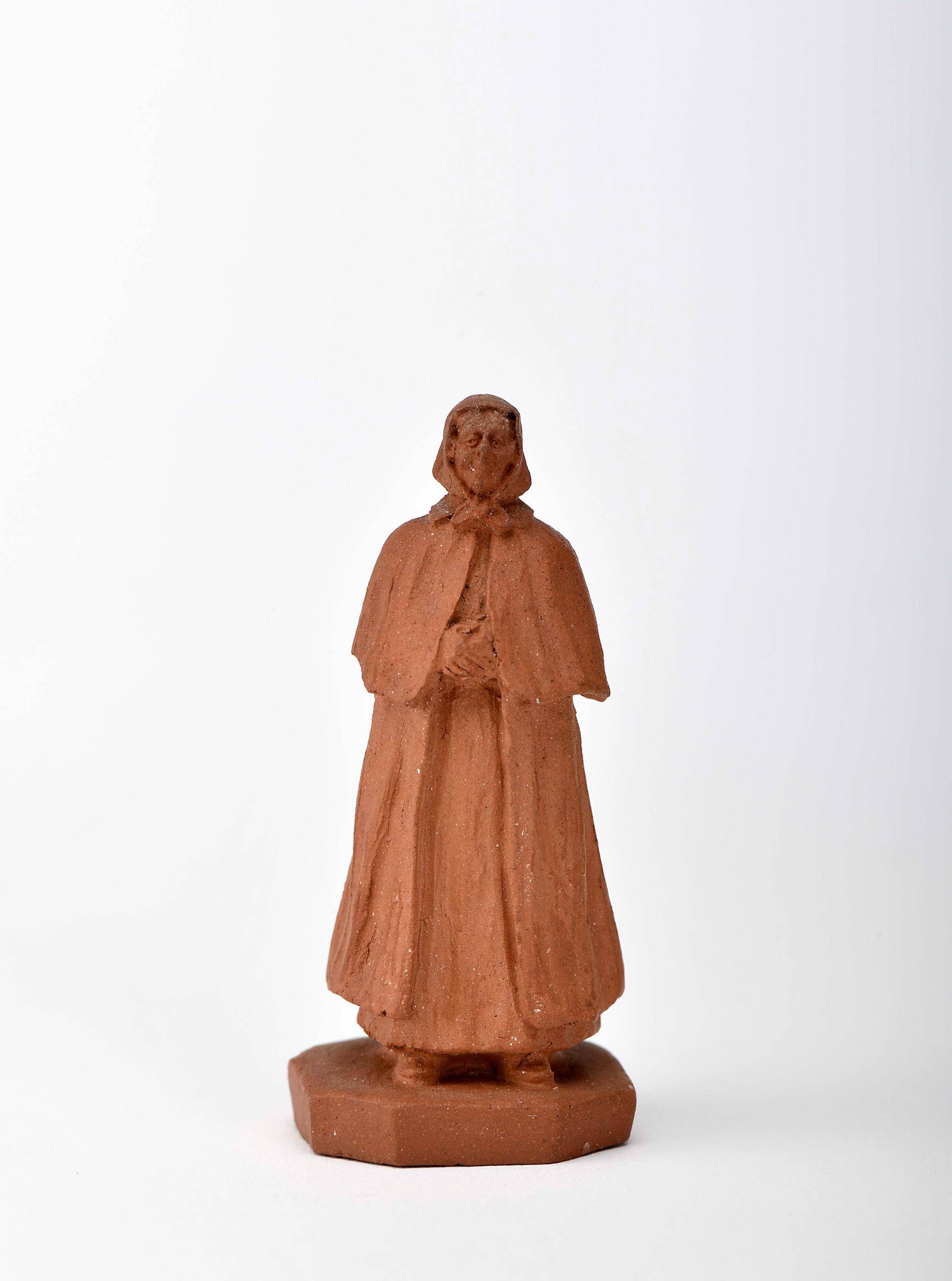 Escultura miniatural - Velha Maria terracota das Caldas assinada RBP [Rafael Bordallo Pinheiro (1884-1905)], modelo de Rafael Bordallo Pinheiro (1884-1905), marca da Fábrica de Faianças das Caldas da Rainha sob direcção artística de Rafael Bordallo Pinheiro (1884-1905), datada de 1903 Dimensões (altura x comprimento x largura) - 5 cm Notas: integrou a colecção de Joaquim Ladeira Baptista.