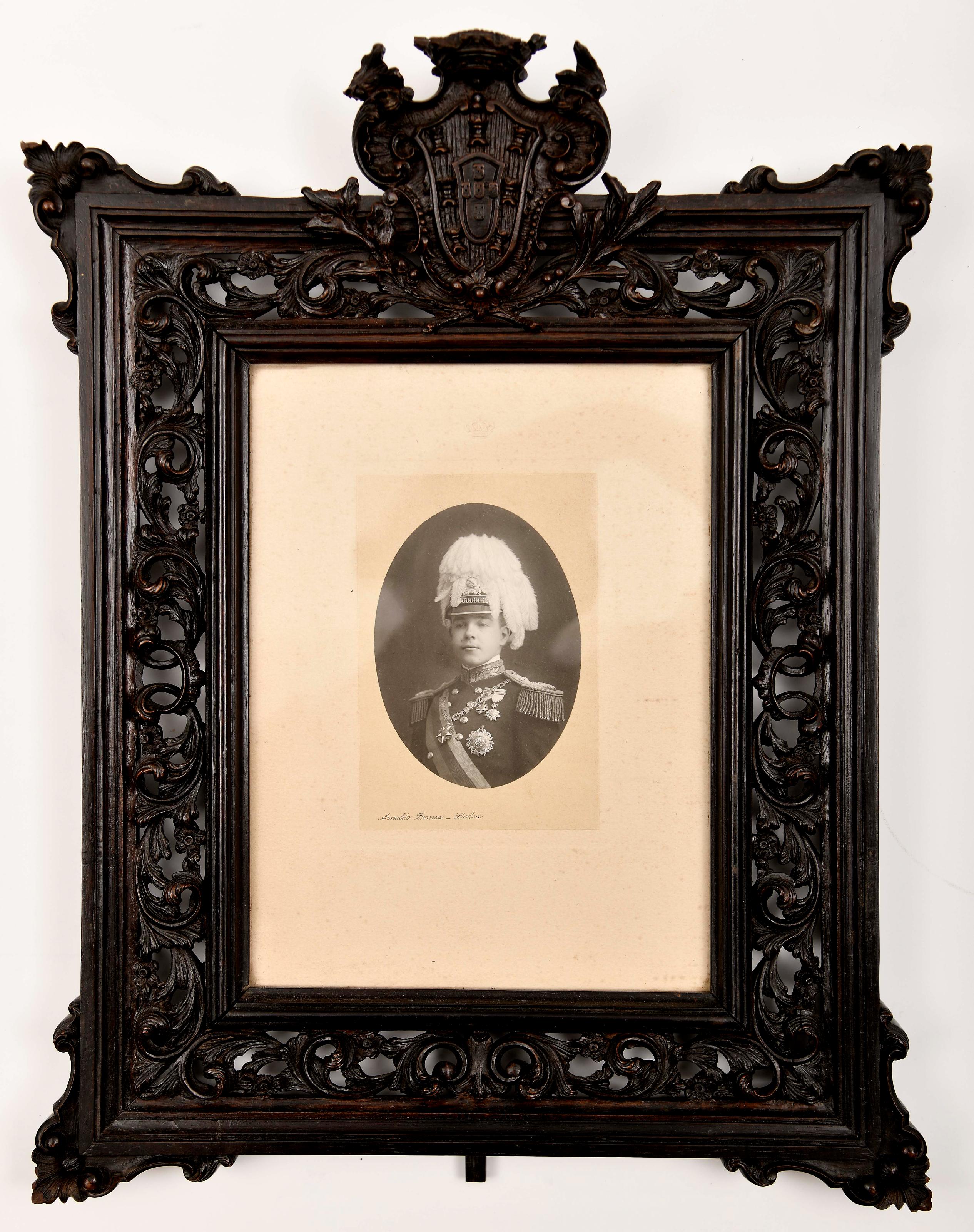 Retrato do Rei D. Manuel II (1889-1932) no dia da sua aclamação pelas cortes - 6 de Maio 1908 fotografia sobre papel passepartout em cartão com coroa real em relevo, moldura de pousar em pau-santo entalhado e vazado "Enrolamentos vegetalistas" encimada por armas do Reino de Portugal, verso e suporte em madeira Portuguesa séc. XX (1º quartel) pequenas faltas nos relevos da moldura assinada ARNALDO FONSECA - LISBOA Dimensões (altura x comprimento x largura) - (fotografia) 14,8 x 10 cm; (moldura) 48 x 36,5 cm Notas: vd. https://monarquiaportuguesa.blogs.sapo.pt/aclamacao-do-rei-d-manuel-ii-na-1407128 - consultado a 12-11-2025 às 08.54.