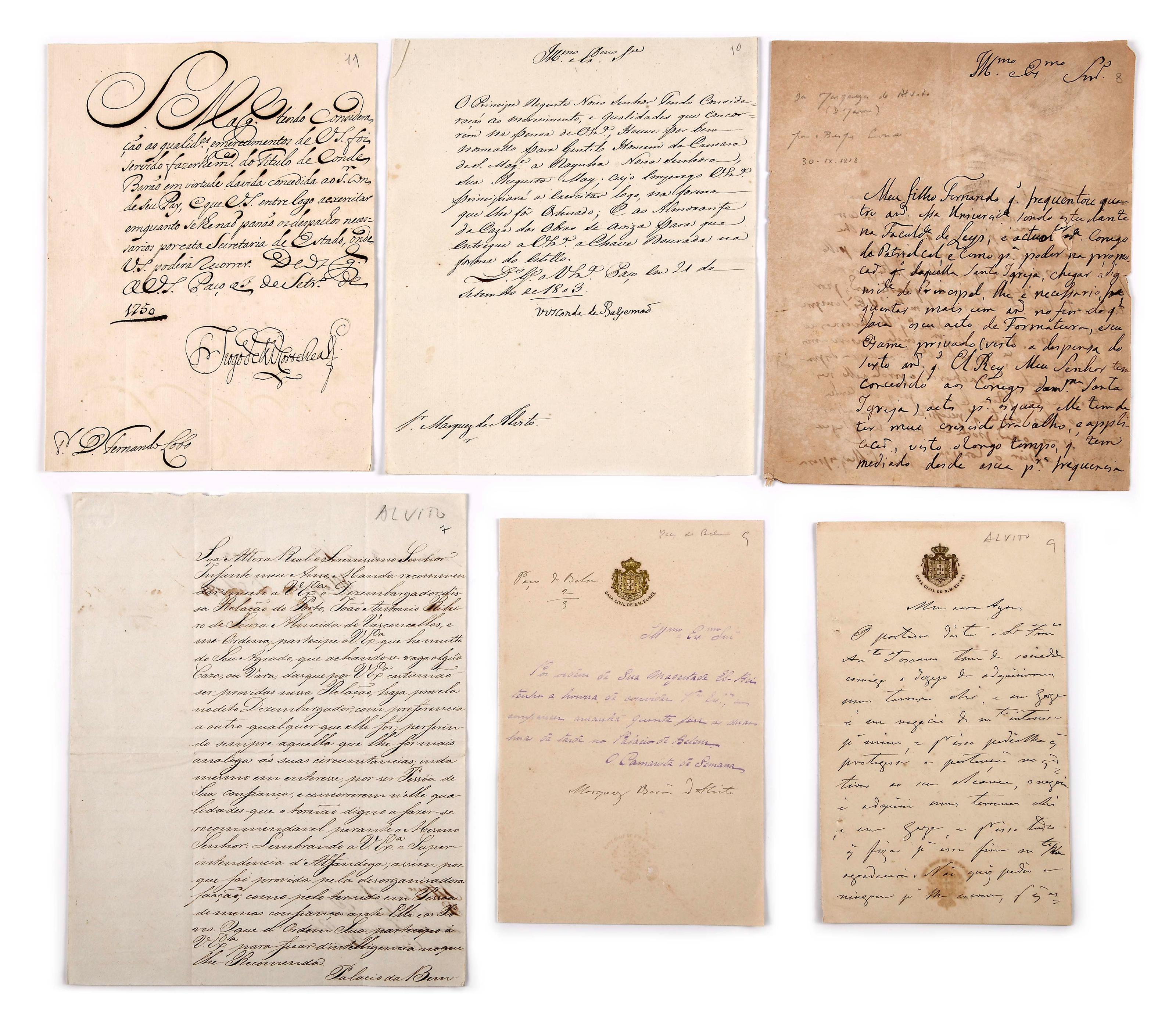 ALVITO, Marqueses de.- Cartas de e para os Marqueses de Alvito.- Séculos XVIII/XIX/XX (1750-1905).- 6 documentos Conjunto constituído pelos seguintes documentos: 1 - Carta (1 p.) de Diogo de M[endonça] Corte Real (ca. 1694-1771), para D. Fernando Lobo, comunicando-lhe a mercê do titulo de conde barão (Paço, 3 de Setembro de 1750); 2 - Carta (1 p.) do visconde de Balsemão (1735-1804) comunicando ao marquês de Alvito, D. José António Plácido Lobo da Silveira Quaresma, a mercê (do Príncipe Regente) da nomeação para gentil-homem da Câmara de Sua Majestade a Rainha (Paço, 21 de Setembro de 1803); 3 - Carta (3 p.) da marquesa de Alvito, D. Isabel Vicência Inês da Cunha e Lorena, para o bispo conde reitor da Universidade de Coimbra, solicitando a dispensa do acto de bacharel e proteção noutros actos, para o seu filho Fernando, cónego da Patriarcal (Alvito. 30 de Setembro de 1818); 4 - Carta (2 p.) do marquês de Alvito, D. José António Plácido Lobo da Silveira Quaresma, para Aires Pinto de Sousa , governador das justiças da Relação e Casa do Porto, a solicitar, um lugar para o desembargador João António Ribeiro de Sousa Almeida de Vasconcelos (Palácio da Bemposta, 3 de Setembro de 1823); 5 e 6 - Duas cartas (2, 1 p.) do marquês de Alvito, D. José Lobo da Silveira Quaresma (5 de Fevereiro e de Março de 1905), a primeira dirigida a Cristóvão Aires de Magalhães Sepúlveda. A carta da marquesa de Alvito (3º documento), com forte acidez.