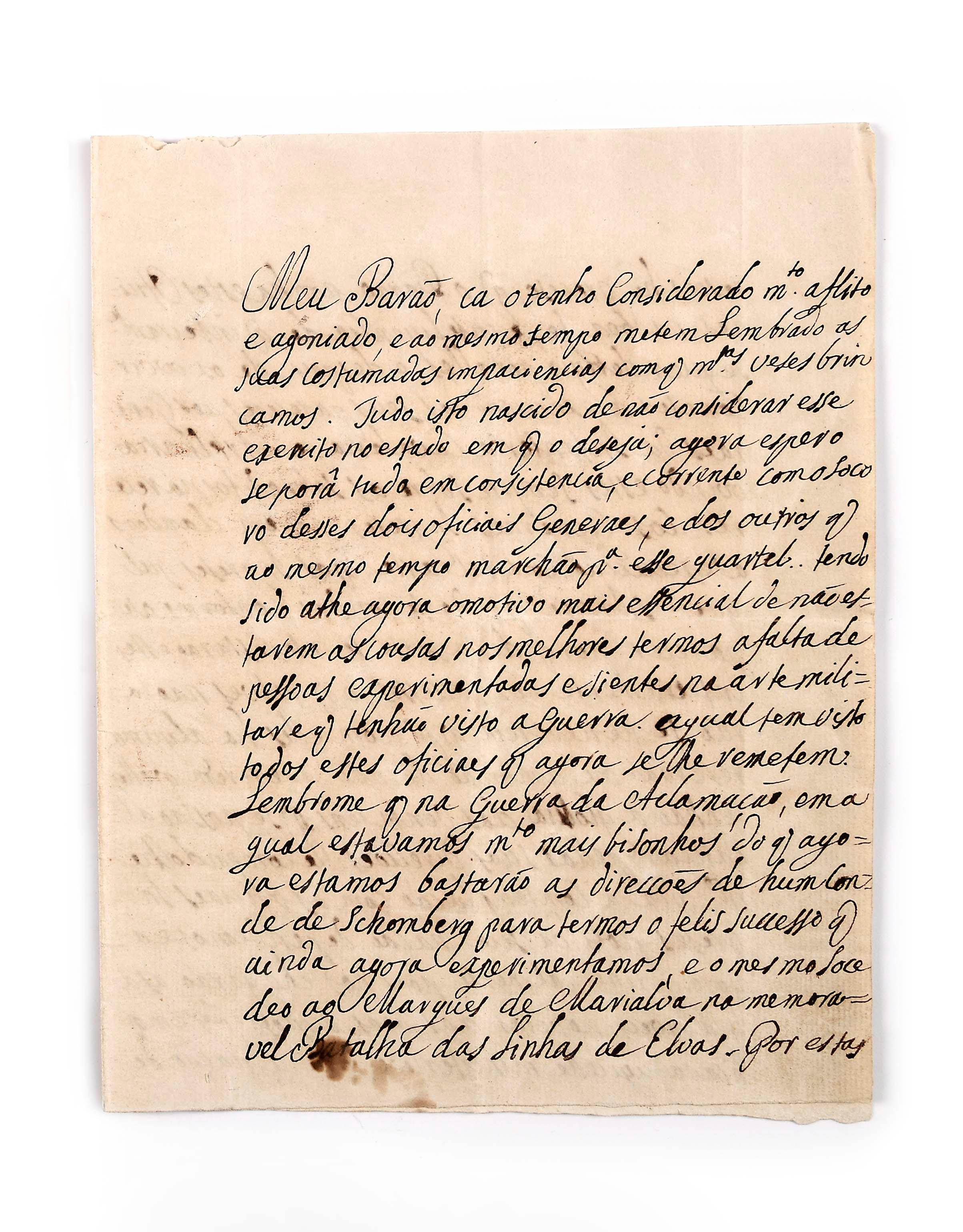 JOSÉ I, D. (Rei de Portugal).- Carta autógrafa.- Século XVIII (1762).- 4 p.; 22 cm. Manuscrito sobre bifólio de papel. Extensa carta missiva, autógrafa, dirigida ao conde barão de Alvito com instruções relativas à condução do Exército, em vésperas da chegada a Portugal do conde de Lippe. D. Fernando José Lobo da Silveira Quaresma (1727-1778), conde barão e 3º marquês de Alvito, foi marechal de campo e tenente-general do Exército Português. Documento inteiramente autógrafo, datado 7 de Junho de 1762, assinado Joseph. Conserva uma capilha com resumo e indicação: Carta escripta pela Real Maõ d’ElRey D. Jozé...”, Maço 14. Num. 15.