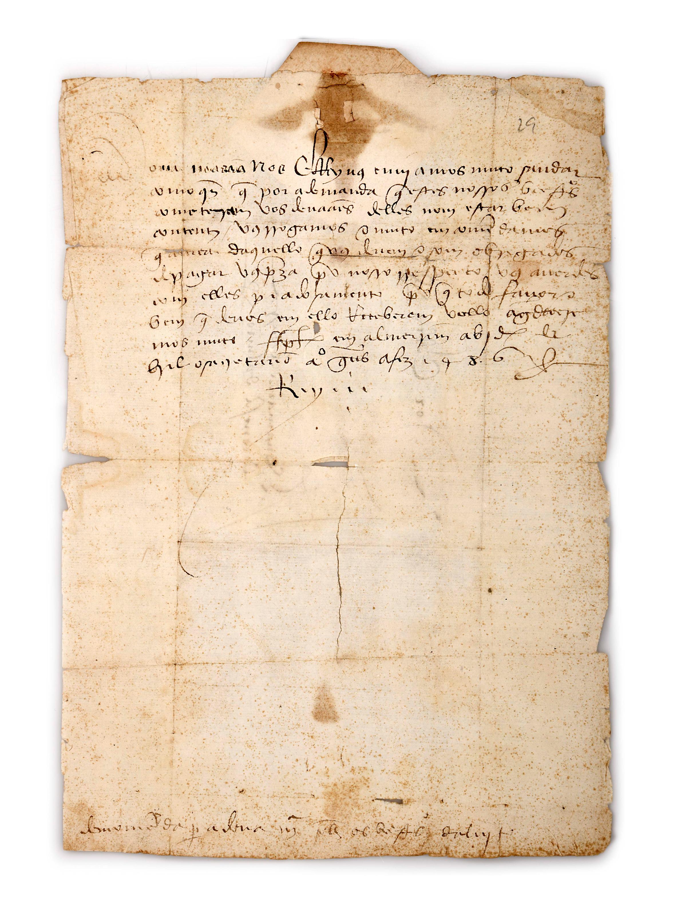 JOÃO II, D. (Rei de Portugal).- Carta régia.- Século XV (1486).- 1 f.; 29 cm. Manuscrito sobre papel, em letra gótica cursiva joanina. Carta pela qual El-Rei D. João II roga a D. Maria para que se houvesse piedosa com os besteiros a respeito de demanda que traziam e que de todo o favor que a eles fizesse, lhe agradeceria. Documento um pouco manuseado e empoeirado, mas inteiramente legível, datado de 6 de Abril de 1486; assinatura autógrafa: Rey; conserva o selo de chapa. Inclui uma cópia autêntica (de 1810) e uma capilha com undicação: Meço 2. Num. 21.