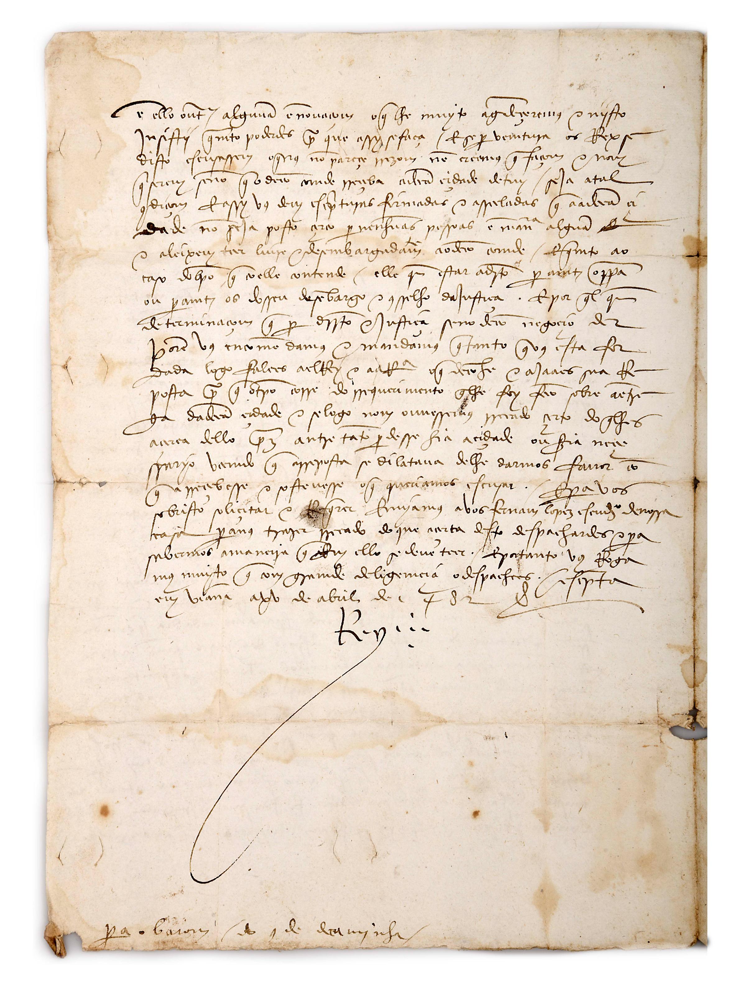 JOÃO II, D. (Rei de Portugal).- Carta régia.- Século XV (1482).- 2 f.(2 p.); 30 cm. Manuscrito sobre papel, em letra gótica cursiva joanina. Carta régia de D. Joao II a D. João Fernandes da Silveira, barão de Alvito, embaixador em Espanha, sobre o casamento do príncipe D. Afonso (1475-1491) com a infanta de Castela (Isabel de Aragão. Documento datado de 11 de Março de 1482. Assinatura autógrafa: Rei. Documento levemente manuseado, mas inteiramente legível, com falta do selo de chapa.