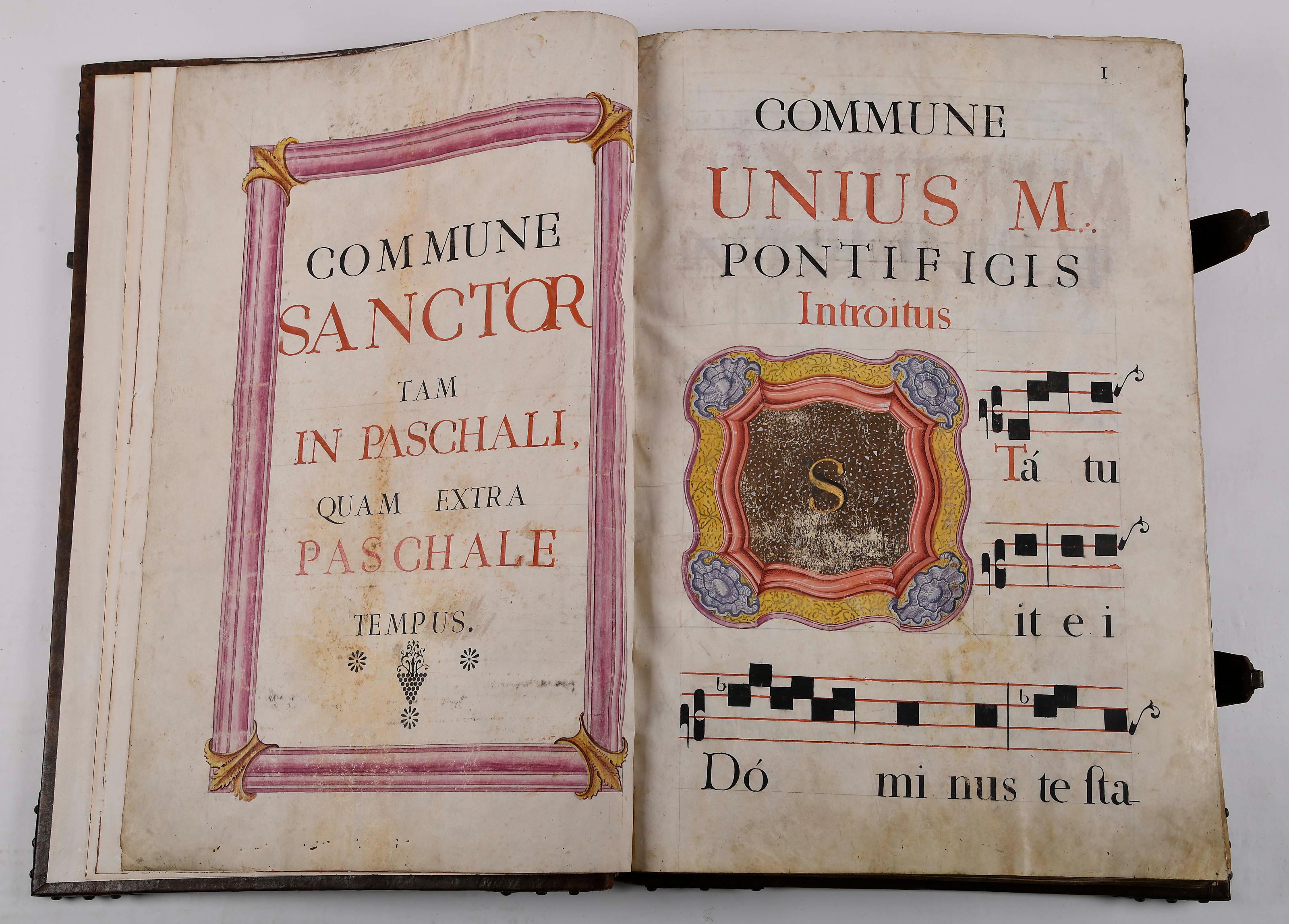 MANUSCRITO MUSICAL.- [GRADUAL].- Commune Sanctor[um].- Século XVIII/XIX.- 1 vol. (292 p.), notação musical; 83 cm.- E. Manuscrito musical (livro de coro ou cantochão) estampilhado sobre pergaminho. Volume de grandes dimensões, contendo 196 folhas, paginadas de 1 a 292, com notação musical quadrada a negro, sobre tetragrama a vermelho (pauta com 4 linhas), claves e guião. Integra cânticos para a liturgia das festas dos santos não pontífices (Santoral ou Comum dos Santos), destinados aos períodos de preparação para a Páscoa (Septuagésima) e Pascal, propriamente dito. O título (no verso da 1ª folha) encontra-se enquadrado por grande moldura iluminada em tons de rosa; igualmente iluminada a primeira inicial da página seguinte (S), com decoração policromada (23x17 cm); todas as restantes iniciais estão enquadradas em molduras estampilhadas a azul. No final, inclui um cântico para a festa do próprio templo, sob a invocação de São João de Capristano, frade franciscano do século XV, canonizado em 1690 pelo papa Alexandre VIII. A ajuizar pelo guião da última pauta, na última página (nota ré), deverão faltar folhas no final. Sólida encadernação da época, inteira de carneira, com patine escurecida e decoração a seco nos planos e lombada, apresentando as seguintes aplicações metálicas em cada pasta: quatro cantos recortados e vazados, quatro brochos redondos; dois fechos completos, com presilhas de couro (um fecho parcialmente solto); ao centro de ambos os planos, um grande super-libros metálico com as armas da Ordem de São Francisco, encimadas por coroa real. Documento em geral bem conservado, apresentando, contudo, algum manuseamento e manchas, sobretudo na canto inferior externo (de manipulação), como é habitual. Manuscrito não datado, mas tendo em conta os aspectos estilísticos e técnicos (estampilhas), poderá ter sido produzido no final do século XVIII ou nos primeiros anos do século seguinte. De proveniência incerta, o volume não parece estar relacionado com a produção de manuscritos musicais de Mafra, mas antes com dois livros de coro existentes na Biblioteca Nacional, respectivamente com as cotas L.C. 344 e 345.