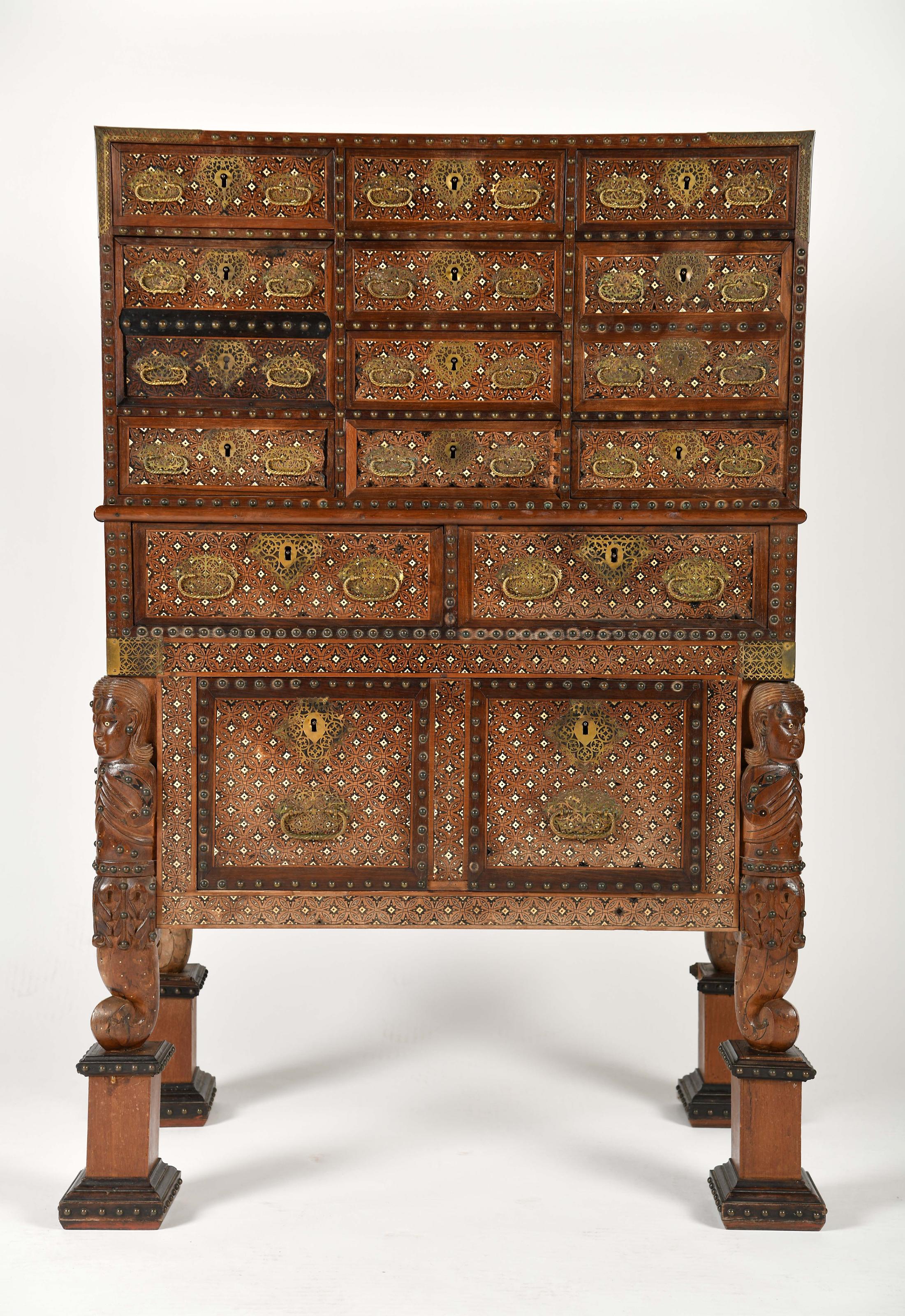 Contador de dez gavetas simulando doze com trempe Lusíada teca revestimento parcial a sissó, embutidos de ébano, sissó e marfim "Círculos secantes - «diaprés»", ferragens em cobre recortado, vazado e dourado, tachas semiesféricas em cobre, base com duas gavetas, gavetão e pernas esculpidas "Nagas" vertente Indo-Portuguesa séc. XVII (2ª metade) falta nos embutidos sobretudo no tampo, outras pequenas faltas e defeitos, falta de tachas nas nagas Dimensões (altura x comprimento x largura) - 133,5 x 95 x 52,5 cm Notas: vd. exemplares semelhantes vd. DIAS, Pedro - “Mobiliário Indo-Português”. Moreira de Cónegos: Imaginalis, 2013, pp. 274-281.a) Este lote está sujeito às restrições CITES de exportação/importação e encontra-se devidamente certificado: nº 25PTLX05088C;b) É actualmente proibida por diversos países a importação de bens que incorporem materiais de espécies da fauna e flora selvagens protegidas, incluindo, entre outros, marfim, coral e tartaruga;c) Em Portugal, em conformidade com a prevista transposição para a legislação nacional das mais recentes orientações da UE relativas ao comércio de marfim, está suspensa a emissão de certificados de reexportação para países que não integrem a UE;d) Neste contexto, aconselham-se os seus potenciais compradores a informarem-se previamente sobre a legislação do seu país e restrições internacionais aplicáveis.