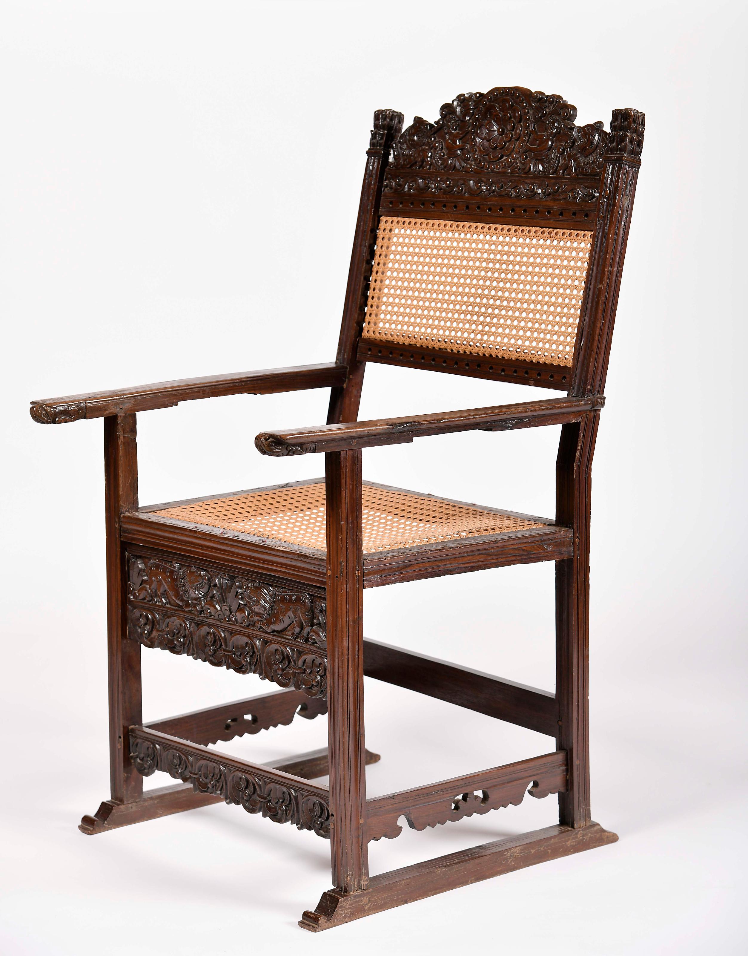 Cadeira de patins Lusíada teca e sissó parte superior do espaldar entalhado "Flor sustida por dois putti ataviados em folhas e com cauda de sereia, enrolamentos vegetalistas e leões", extremidades dos braços esculpidas "Cabeça e patas de leão", extremidades das prumadas entalhadas, saial e travejamento recortados e entalhados "Leões afrontados" e "Enrolamentos vegetalistas" vertente Indo-Portuguesa séc. XVI/XVII pequenas faltas e defeitos, assento e espaldar com palhinha não original substituindo a corda de fibra de bananeira Dimensões (altura x comprimento x largura) - 105 x 57,5 x 64,5 cm Notas: vd. exemplares semelhantes em PINTO, Maria Helena Mendes - "Sentando-se em Goa". In Oceanos, nº 19/20, "Indo-portuguesmente", pp. 43-58. Lisboa: Comissão Nacional para as Comemorações dos Descobrimentos Portugueses, 1994, pp. 46-47, figs. 3 e 4; e catálogo da exposição “A Madeira nas Rotas do Oriente”. Funchal: Câmara Municipal do Funchal, 2005, pp. 30-31.